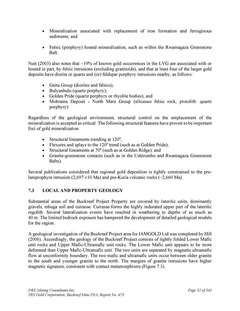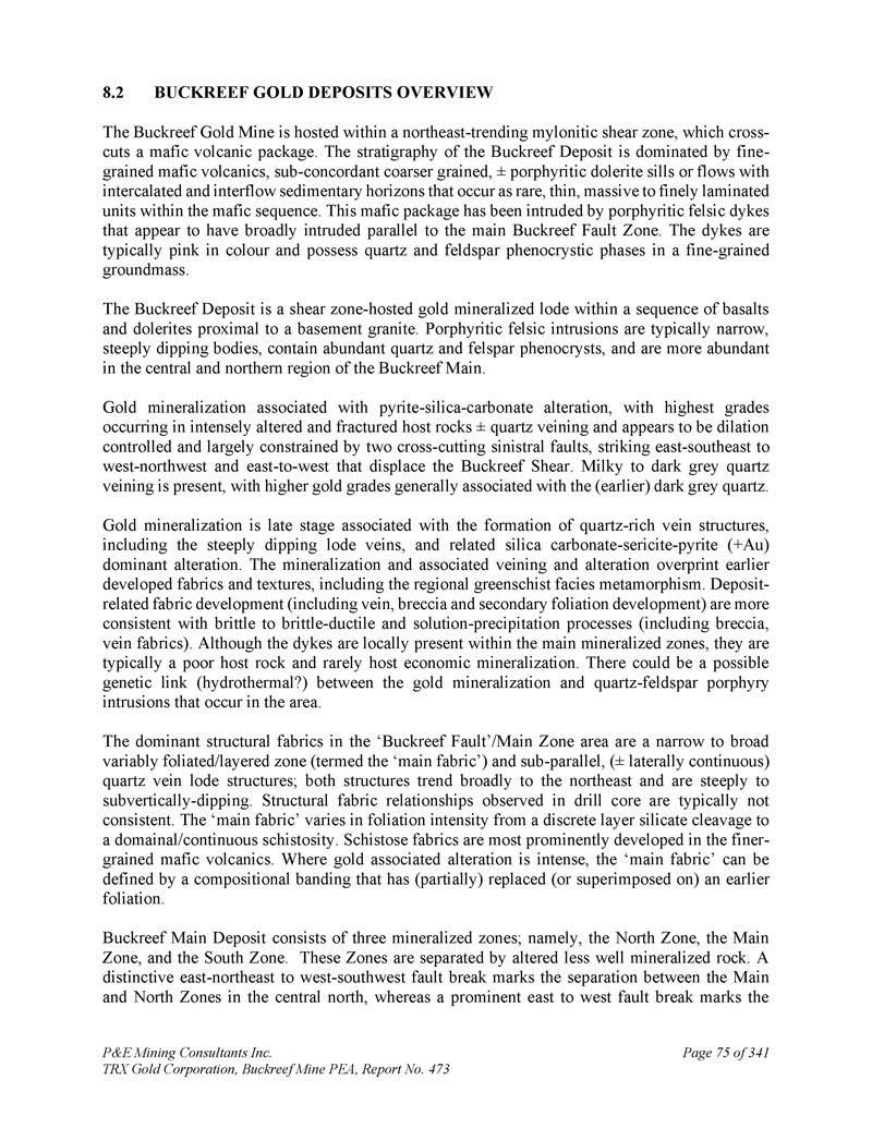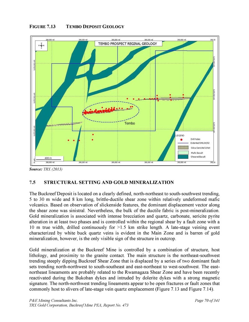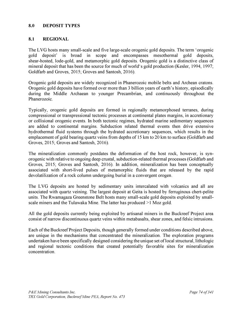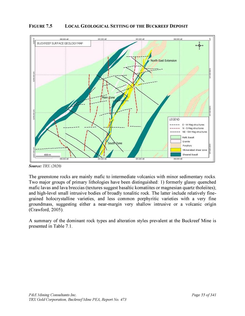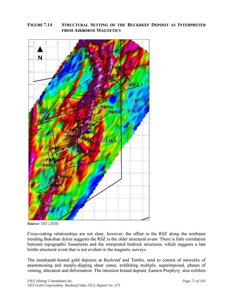 P & E Mining Consultants Inc. TRX Gold Corporation,Buckreef Mine PEA,第473号报告,第289页,共341个地层和metagabbro堤坝或窗台。当地的地层被折叠成一个向南俯冲的大型Z形褶皱。该褶皱的背斜部分被一条与南倾褶皱轴向面亚平行的逆冲断层切割。金主要以游离金的形式存在于石英脉或储层中,通常与长英质侵入岩有关。Tulawaka是STAMICO的子公司Stamigold目前拥有的勘探项目和金矿;而Bulyanhulu矿:位于Buckreef矿以东~50公里处。Bulyanhulu的地质由一系列火山碎屑岩和灰凝灰岩覆盖的镁铁质火山流组成。镁铁质和长英质岩石的接触处存在阿吉利特。金、银、铜矿化发生在沿陡倾西北走向构造定位的矿化“礁石”或石英脉中,一般在泥质岩单元中。该矿山归巴里克黄金公司所有。LVG代表了一个重要的、大规模的黄金省份,在这个省份中,区域成矿热液流体系统利用流变、地球化学和结构边界,将黄金作为矿藏重新调集和浓缩。Buckreef项目发生在存在类似岩性和结构特征的LVG中,因此理论上可能具有潜在的前景。作者没有核实有关Geita、Tulawaka和Bulyanhulu矿山的公共领域信息,所提供的信息不一定表明Buckreef项目的矿化情况。