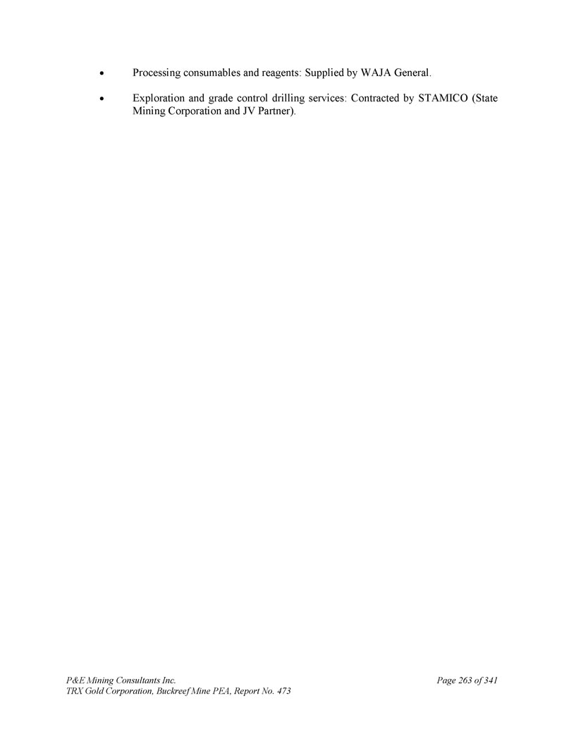 P & E Mining Consultants Inc. TRX Gold Corporation,Buckreef Mine PEA,Report No. 473 page 263 of 341加工耗材和试剂:由WAJA General提供。勘探和品位控制钻井服务:由STAMICO(国营矿业公司和合资伙伴)承包。