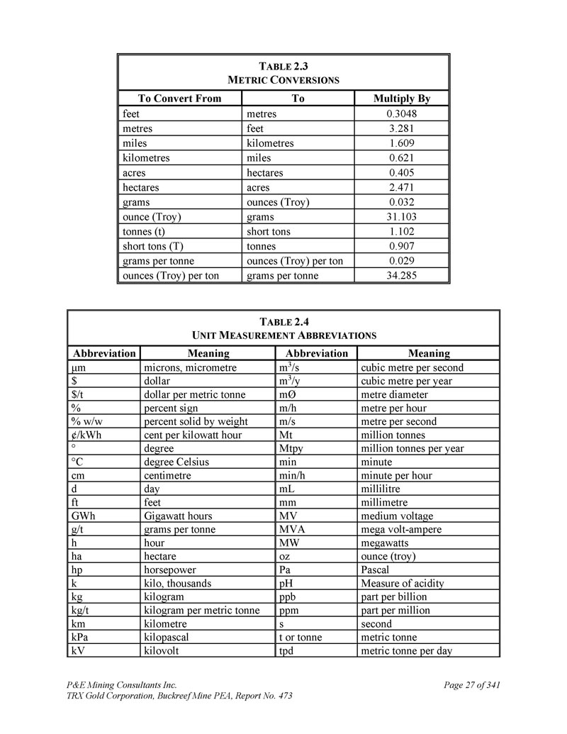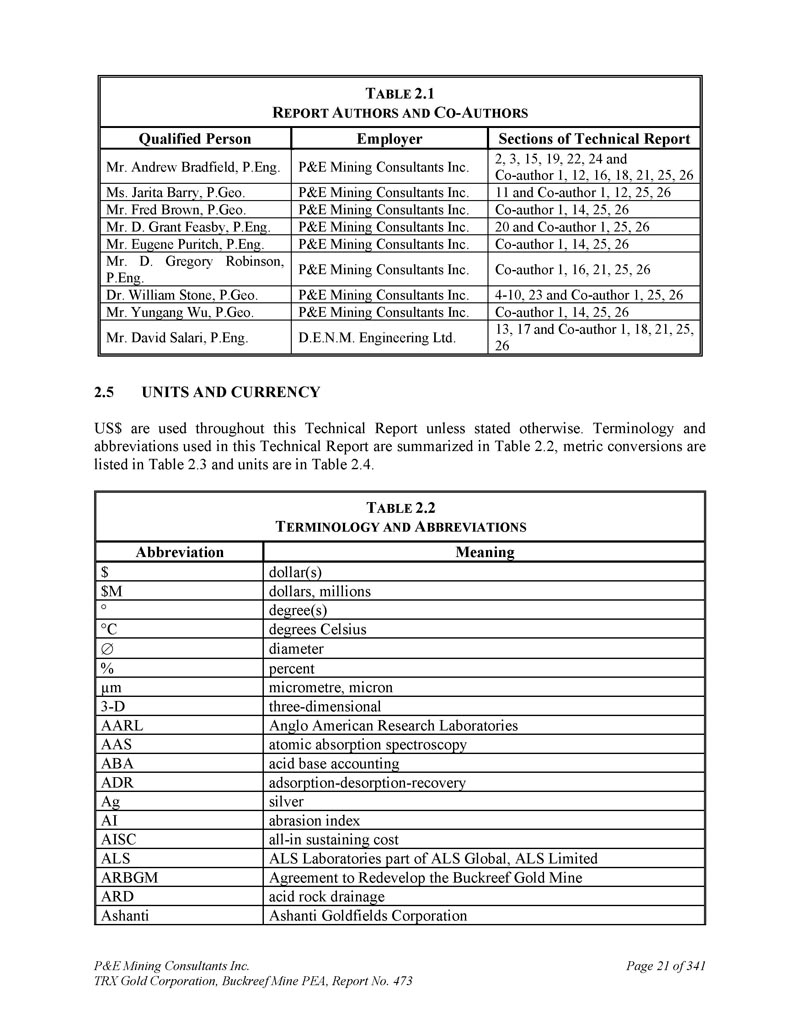 P & E Mining Consultants Inc. TRX Gold Corporation,Buckreef Mine PEA,Report No. 473 Page 21 of 341 T ABLE 2.1 R EPORT A UTHORS and C O-A UTHORS Sections of Technical Report Employer Qualified Person 2,3,15,19,22,24 and Co-author 1,12,16,18,21,25,26 P & E Mining Consultants Inc. Andrew Bradfield先生,P.Eng。11和共同作者1、12、25、26 P & E Mining Consultants Inc. Jarita Barry女士,P.Geo。共同作者1,14,25,26 P & E Mining Consultants Inc. Mr. Fred Brown,P.Geo。20 and co-author 1,25,26 P & E Mining Consultants Inc. Mr. D. Grant Feasby,P.Eng。共同作者1,14,25,26 P & E Mining Consultants Inc. Mr. Eugene Puritch,P.Eng。共同作者1,16,21,25,26 P & E Mining Consultants Inc. D. Gregory Robinson先生,P.Eng。4-10,23和共同作者1,25,26 P & E Mining Consultants Inc. Dr. William Stone,P.Geo。共同作者1,14,25,26 P & E Mining Consultants Inc. Mr. Yungang Wu,P.Geo。13、17和共同作者1、18、21、25、26 D.E.N.M. Engineering Ltd. David Salari先生,P.Eng。2.5本技术报告通篇使用单位和货币美元,除非另有说明。本技术报告中使用的术语和简称汇总于表2。2、度量转换列于表2。3,单位见表2。4 .T ABLE 2.2T ERMINOLOGY和A BBREVIATIONS含义缩写USD(s)$ dollars,millions $ M degrees(s)丨Degrees丨Degrees丨C dialence %% micrometer,micron μ m三维3-d Anglo American Research Laboratories AARL原子吸收光谱AAS酸碱核算ABA吸附-解吸-回收ADR银Ag磨损指数AI all-in maintenance cost AISC ALS Laboratories part of ALS Global,ALS Limited ALS Agreement to Reddevelop the Buckreef Gold Mine ARBGM酸性岩石排水ARD Ashanti Goldfields Corporation Ashanti