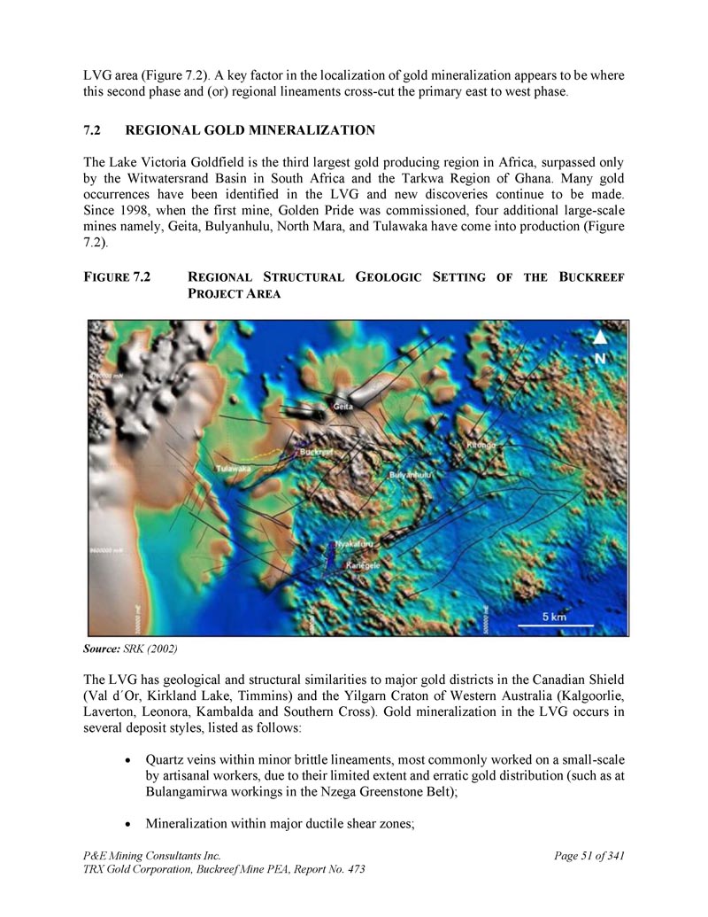 LVG地区(图7。2 ) .金矿化局部化的一个关键因素似乎是这个第二阶段和(或)区域线条在哪里交叉切割初级东向西阶段。7.2区域黄金矿化维多利亚湖金矿是非洲第三大黄金产区,仅次于南非的威特沃特斯兰德盆地和加纳的塔尔克瓦地区。在LVG中发现了许多金矿,并不断有新发现。自1998年第一座矿山Golden Pride投产以来,新增Geita、Bulyanhulu、North Mara、Tulawaka四座大型矿山投产(图7。2 ) .F IGURE 7.2 R EGIONAL S TRUCTURAL G EOLOGIC S ETTING of the B UCKREEF P ROJECT A REA资料来源:SRK(2002)LVG与加拿大地盾(Val d Or、Kirkland Lake、Timmins)和西澳大利亚Yilgarn克拉通(Kalgoorlie、Laverton、Leonora、Kambalda和Southern Cross)的主要黄金区域具有地质和结构相似性。LVG中的金矿化出现在几种矿床样式中,列出如下:小脆纹内的石英脉,最常由手工工人小规模开采,因为其范围有限且金分布不稳定(例如在Nzega绿岩带的Bulangamirwa工作区);主要韧性剪切带内的矿化;P & E Mining Consultants Inc. TRX Gold Corporation,Buckreef Mine PEA,报告第473页,共341页