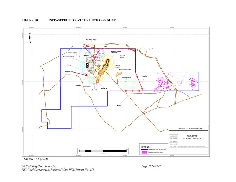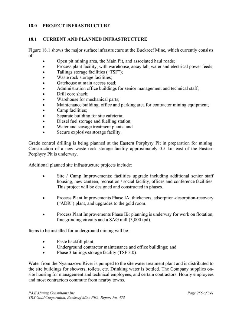 P & E Mining Consultants Inc. TRX Gold Corporation,Buckreef Mine PEA,第473号报告,第341页第256页1。项目基础设施2。当前和规划中的基础设施图18.1显示了Buckreef矿的主要地面基础设施,目前包括:露天矿区、主坑和相关的运输道路;加工厂设施,有仓库、化验实验室、水和电力馈电;尾矿储存设施(“TSF”);废石储存设施;主要通道的门楼;高级管理人员和技术人员的行政办公楼;钻芯窝棚;机械零件仓库;维修大楼,承包商采矿设备的办公和停车区;营地设施;场地食堂的单独建筑;柴油燃料储存和加气站;水和污水处理厂;以及安全的爆炸物储存设施。正计划在东部斑岩矿坑进行品位控制钻探,为开采做准备。建造新的废石储存设施约为0。东部斑岩矿坑以东5公里处正在进行中。其他计划中的场地基础设施项目包括:场地/营地改善:设施升级,包括增加高级职员住房、新食堂、娱乐/社会设施、办公室和会议设施。这一项目将分期设计建设。工艺装置改进阶段IA:增稠剂、吸附-解吸-回收(“ADR”)装置,并升级至黄金室。工艺装置改进阶段IB:正在规划关于浮选、细磨电路和SAG磨机(3000吨/日)的工作。将安装用于地下采矿的项目将是:浆料回填厂;地下承包商维修和办公楼;以及第三期尾矿储存设施(TSF3.0)。来自Nyamazovu河的水被抽到现场水处理厂,并分配给现场建筑物用于淋浴、厕所等。饮用水是瓶装的。该公司为管理和技术员工以及某些承包商提供现场房屋。钟点工和大多数承包商从附近的城镇通勤。