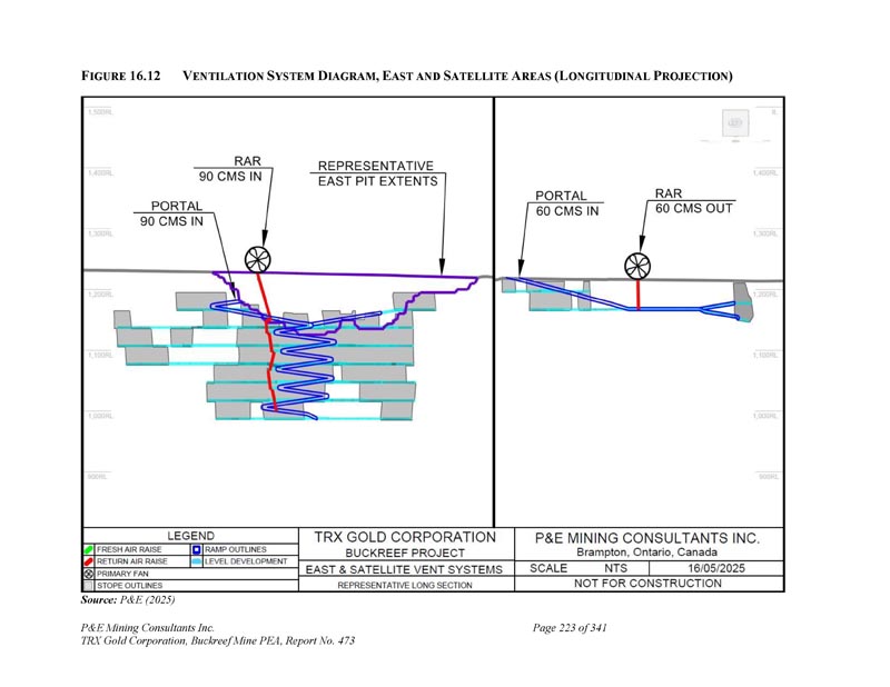 F IGURE 16.12 V ENTILATION S YSTEM D IAGRAM,E AST和S ATELLITE A REAS(L ONGITUDINAL P ROJECTION)资料来源:P & E(2025)P & E Mining Consultants Inc. TRX Gold Corporation,Buckreef Mine PEA,第473号报告,共341页第223页
