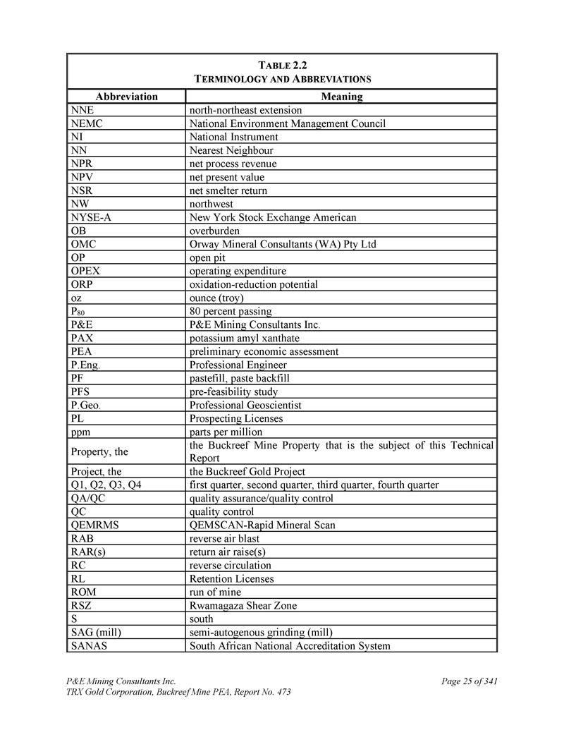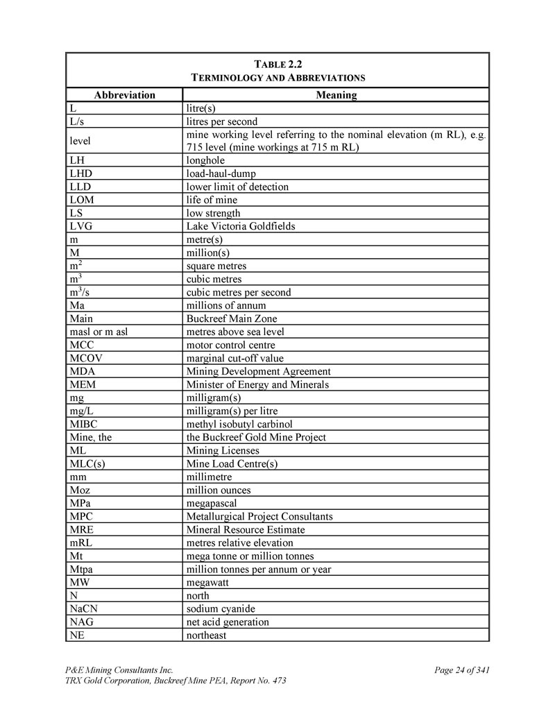 P & E Mining Consultants Inc. TRX Gold Corporation,Buckreef Mine PEA,Report No. 473 Page 22 of 341 T ABLE 2.2 T ERMINOLOGY and a BBREVIATIONS meaning abbreviations gold au(s)author(s)of the section of technical report author(s)average avg Buckreef Assay Laboratory丨BAL 丨BAL Buckreef Gold Company Limited BGC带状铁层BIF Buckreef再开发协议BRDA债券工作指标,债券球磨机工作指标BWI氧化钙CaO资本支出CAPEX碳在浸出中的应用CIL加拿大矿业、冶金和石油CIM研究所CMS氰化物CN TRX Gold Corporation Company,变异系数CoV截止值COV认证参比材料控制样品CRM(s)金刚石岩芯直流金刚石钻孔DDH D.E.N.M. Engineering Ltd. D.E.N.M. Buckreef金矿床,Deswik采场优化器DSO开发截止值DCOV东E东非矿业有限公司EAM东非矿业公司EAMC东部斑岩区东部经济截止值ECOV有效磨削长度EGL环境影响评估环评标高EL估计线性超限和脱落ELOS Emisha Mining Innovations EMI Engineer Engine.等效米eq m环境和社会影响评估ESIA新风提升(s)FAR(s)铁Fe前端装载机FEL浮选浮选浮选浮选浮选浮选浮选浮选浮选浮选浮选浮选浮选浮选浮选浮选浮选浮选浮选浮选浮选浮选浮选浮选浮选浮选浮选浮选浮选浮选浮