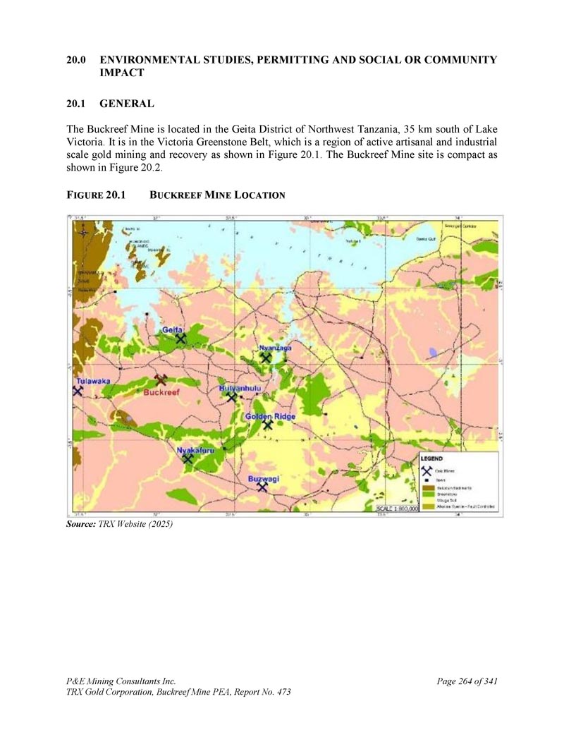 1.环境研究、许可和社会或社区影响2。Buckreef矿一般位于坦桑尼亚西北部的Geita区,维多利亚湖以南35公里。它位于维多利亚绿岩带,如图20所示,这是一个活跃的手工和工业规模金矿开采和回收区域。1 .如图20所示,Buckreef矿址非常紧凑。2 .F IGURE 20。1 b UCREEF M INE L OCATION来源:TRX网站(2025)P & E Mining Consultants Inc.,TRX Gold Corporation,Buckreef Mine PEA,报告第473号,共341页第264页