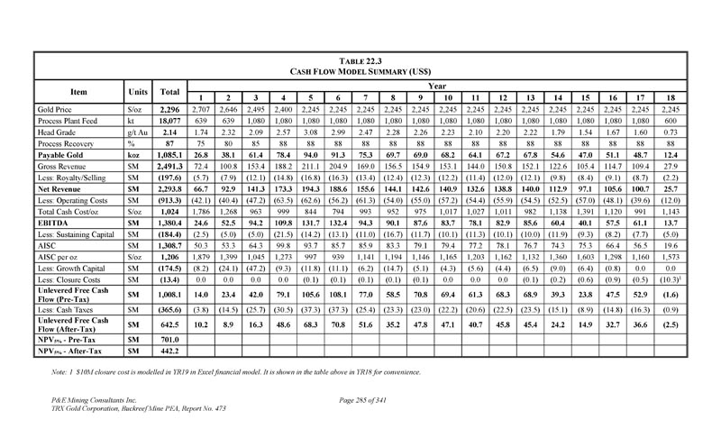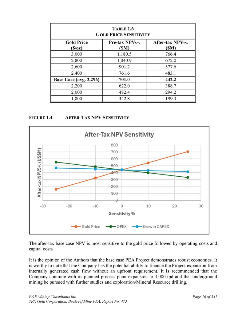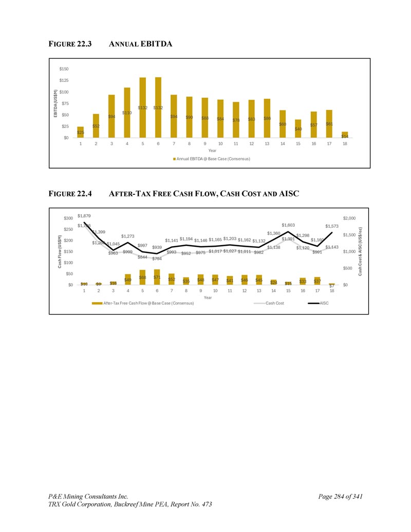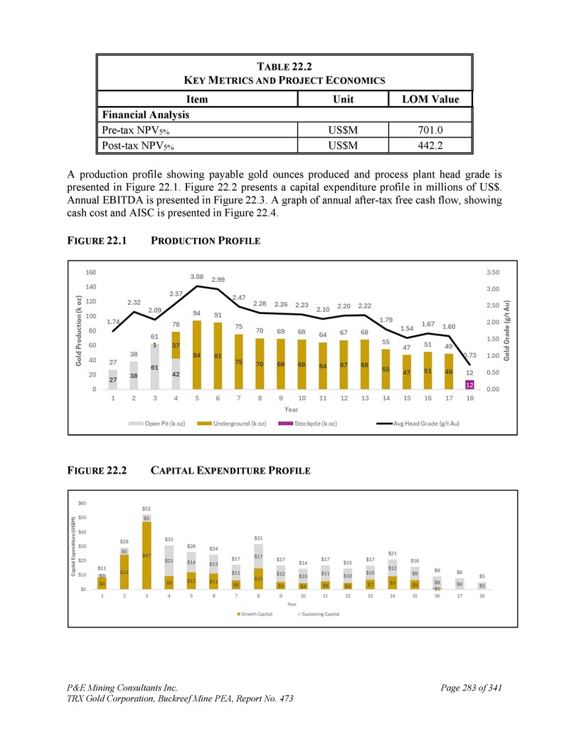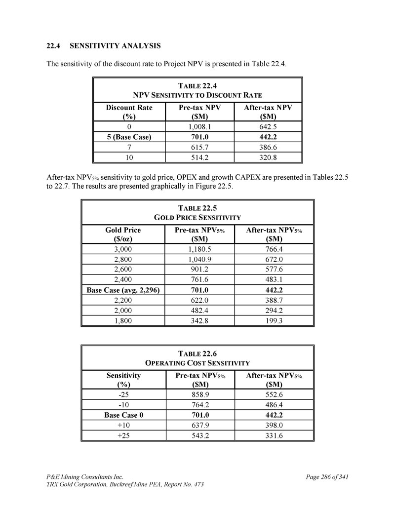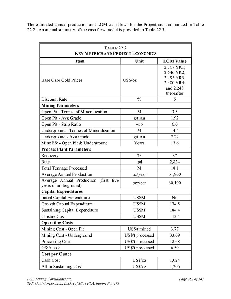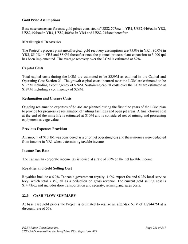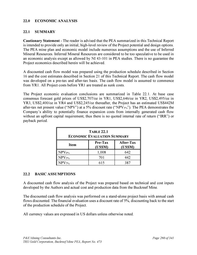 P & E Mining Consultants Inc. TRX Gold Corporation,Buckreef Mine PEA,第473号报告,共3411页第280页。经济分析2。摘要警告声明-请读者注意,本技术报告中概述的PEA仅旨在提供对项目潜力和设计选项的初步、高级别审查。PEA矿山计划和经济模型包括众多假设和推断矿产资源的使用。推断的矿产资源被认为过于投机,无法用于经济分析,除非PEA研究中的NI 43-101允许。无法保证将实现本文所述的项目经济性。使用第16节中描述的生产计划和本技术报告第21节中描述的成本估算编制了贴现现金流模型。现金流模型是在税前和税后基础上开发的。假设现金流模型从YR1开始。YR1之前的所有项目成本均作为沉没成本处理。项目经济评价结论汇总于表22。1 .在基本情况下,共识预测金价在第1年为2,707美元/盎司,第2年为2,646美元/盎司,第3年为2,495美元/盎司,第4年为2,400美元/盎司,此后为2,245美元/盎司,按5%贴现率(“NPV5 %”)计算,该项目的税后净现值(“NPV”)估计为4.42亿美元。PEA表明公司有能力从内部产生的现金流中为扩张成本提供潜在融资,而无需预先资本要求,因此没有报价的内部收益率(“IRR”)或回收期。T ABLE 22.1 E CONOMIC E VALUATION S UMMARY税后(US $ M)税前(US $ M)项目6421,008 NPV0 % 442701 NPV5 % 387615 NPV7 % 22.2基本假设根据作者开发的技术和成本投入以及Buckreef矿的实际成本和生产数据,编制了项目的贴现现金流分析。折现现金流分析在独立项目基础上进行,年度现金流折现。财务评估采用5%的贴现率,折回至项目投产进度开始时。除非另有说明,所有货币价值均以美元表示。