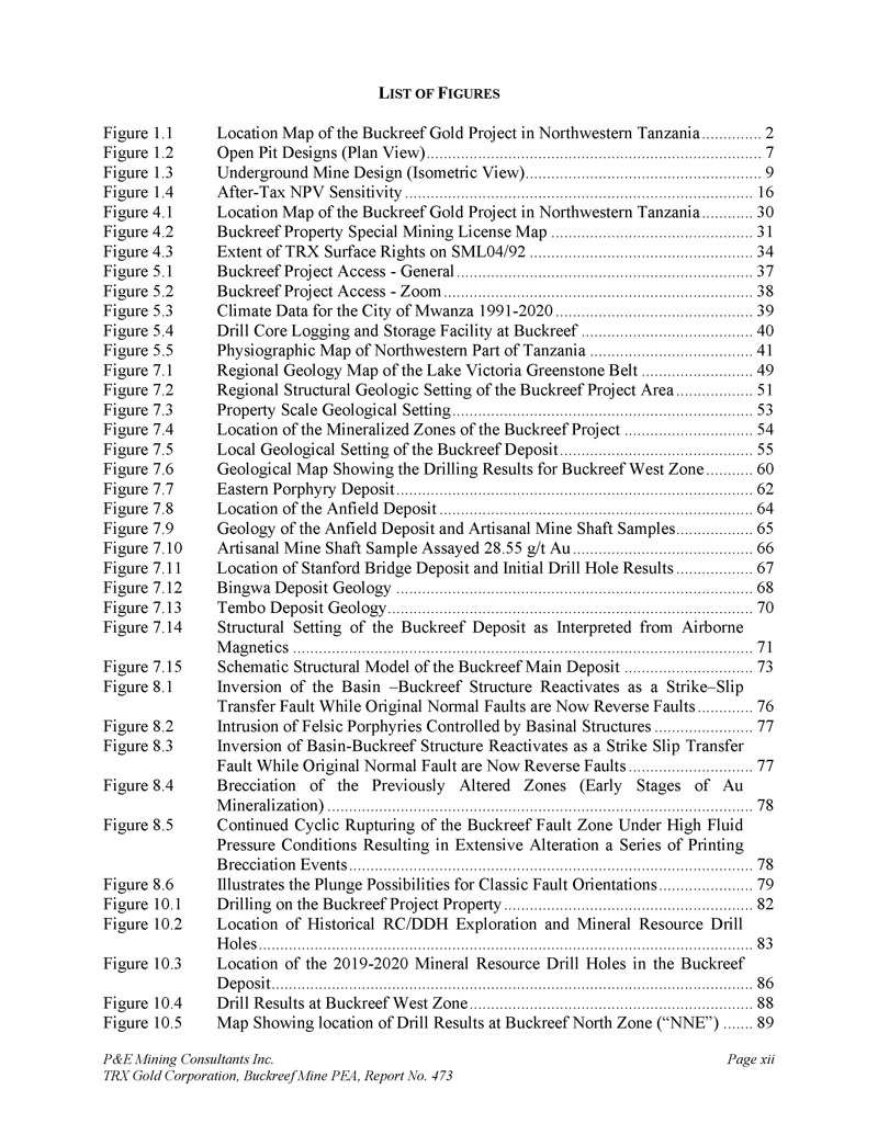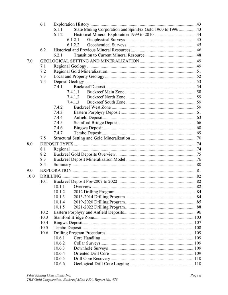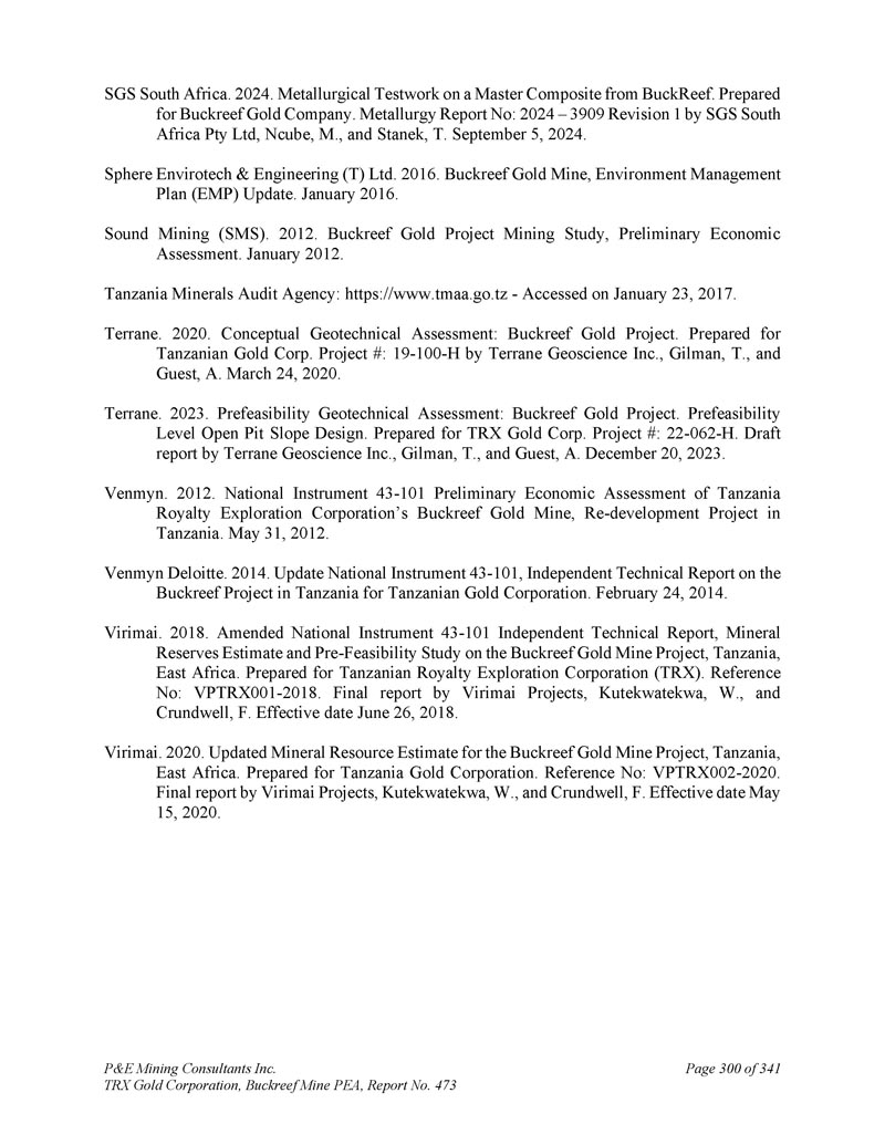 P & E Mining Consultants Inc. TRX Gold Corporation,Buckreef Mine PEA,Report No. 473 page 300 of 341 SGS South Africa。2024 .BuckReef的Master Composite的冶金测试工作。为Buckreef黄金公司做准备。冶金报告编号:2024 – 3909修订版1,由SGS South Africa Pty Ltd,Ncube,M.和Stanek,T. 2024年9月5日。Sphere EnviroTech & Engineering(T)Ltd. 2016。Buckreef金矿,环境管理计划(EMP)更新。2016年1月。声音挖掘(SMS)。2012 .Buckreef黄金项目采矿研究,初步经济评估。2012年1月。坦桑尼亚Minerals审计机构:https://www.tmaa.go.tz-2017年1月23日访问。地体。2020.概念岩土评估:Buckreef金矿项目。为坦桑尼亚黄金 Corp.项目#准备:19-100-H由Terrane Geoscience Inc.、Gilman,T.和Guest,A.于2020年3月24日。地体。2023 .预可行性岩土工程评估:Buckreef金矿项目。预可行性水平露天坑边坡设计。为TRX Gold Corp.项目#准备:22-062-H. Terrane Geoscience Inc.、Gilman,T.和Guest,A.的报告草稿,2023年12月20日。文明。2012 .National Instrument 43-101坦桑尼亚版税勘探公司Buckreef金矿初步经济评估,坦桑尼亚再开发项目。2012年5月31日。Venmyn德勤。2014 .Update National Instrument 43-101,《Tanzanian Gold Corporation坦桑尼亚Buckreef项目独立技术报告》。2014年2月24日。Virimai。2018 .修订了东非坦桑尼亚Buckreef金矿项目的National Instrument 43-101独立技术报告、矿产储量估算和预可行性研究。为坦桑尼亚版税勘探公司(TRX)准备。参考编号:VPTRX 001-2018。Virimai Projects,Kutekwatekwa,W.和Crundwell,F.的最终报告。生效日期2018年6月26日。Virimai。2020 .东非坦桑尼亚Buckreef金矿项目更新矿产资源估算。为坦桑尼亚黄金公司做准备。参考编号:VPTRX 002-2020。Virimai Projects,Kutekwatekwa,W.和Crundwell,F.的最终报告。生效日期为2020年5月15日。