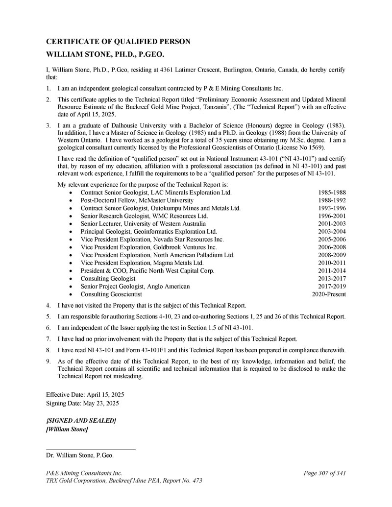 合格人员证书William Stone,博士,P.GEO。本人,William Stone,Ph.D.,P.Geo,居住在4361 Latimer Crescent,Burlington,Ontario,Canada,兹证明:1。我是P & E Mining Consultants Inc. 2签约的独立地质顾问。本证书适用于题为“坦桑尼亚Buckreef金矿项目的初步经济评估和更新的矿产资源估算”的技术报告(“技术报告”),生效日期为2025年4月15日。3.我是达尔豪西大学的毕业生,地质学理学学士(荣誉)学位(1983年)。此外,我还拥有西安大略大学地质学理学硕士学位(1985年)和地质学博士学位(1988年)。自获得硕士学位以来,我作为地质学家一共工作了35年。我是一名地质顾问,目前获得安大略省专业地球科学家(1569号许可证)的许可。本人已阅读National Instrument 43-101(“NI 43-101”)中对“合格人员”的定义,并证明,由于本人的学历、与专业协会的隶属关系(如NI 43-101中所定义)和过去的相关工作经验,本人符合NI 43-101中的“合格人员”要求。就技术报告而言,我的相关经历是:合同高级地质学家,LAC Minerals勘探有限公司博士后研究员,麦克马斯特大学合同高级地质学家,奥托昆普矿业和金属有限公司高级研究地质学家,WMC资源有限公司高级讲师,西澳大利亚大学首席地质学家,GeoInformatics Exploration Ltd.勘探副总裁,Nevada Star Resources Inc.勘探副总裁,Goldbrook Ventures Inc.勘探副总裁,North American Palladium Ltd.勘探副总裁,Magma Metals Ltd.总裁兼首席运营官,Pacific North West Capital Corp.咨询地质学家高级项目地质学家,英美资源集团咨询地球科学家1985-1988 1988-1992 1993-1996 1996-2001 2001-2003 2003 2003-20042005-20062006-20082008-20092010-20112011-20142013-20172017-20192020-至今4。我没有访问过本技术报告主题的物业。5.本人负责编写本技术报告第4-10、23节和共同编写第1、25和26节。6.我独立于发行人应用NI 43-101第1.5节中的测试。7.我之前没有参与过本技术报告主题的物业。8.我已经阅读了NI 43-101和表格43-101F1,本技术报告是按照这些标准编写的。9.截至本技术报告生效之日,据本人所知、所知及所信,技术报告载有为使技术报告不具误导性而需披露的所有科学技术信息。生效日期:2025年4月15日签署日期:2025年5月23日{签署并盖章} [ William Stone ] Dr. William Stone,P.Geo。P & E Mining Consultants Inc. TRX Gold Corporation,Buckreef Mine PEA,报告第473号,共341页第307页