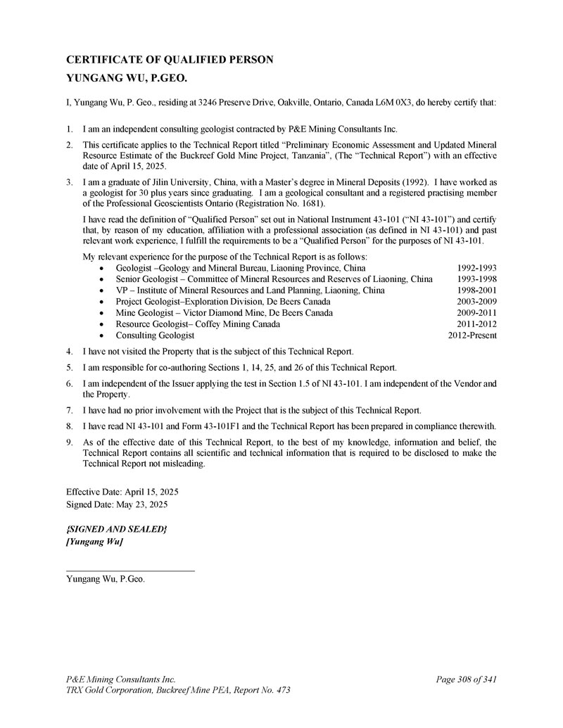 合格人员证书YUNGANG WU,P.GEO。本人,Yungang Wu,P. Geo.,居住于3246 Preserve Drive,Oakville,Ontario,Canada L6M 0X3,兹证明:1。我是P & E Mining Consultants Inc. 2聘用的独立咨询地质学家。本证书适用于题为“坦桑尼亚Buckreef金矿项目初步经济评估和更新的矿产资源估算”的技术报告(“技术报告”),生效日期为2025年4月15日。3.本人毕业于中国吉林大学,矿藏专业硕士研究生(1992年)。毕业后,我当了30多年的地质学家。我是一名地质顾问,也是安大略省专业地球科学家协会(注册号:1681)的注册执业会员。本人已阅读National Instrument 43-101(“NI 43-101”)中对“合格人员”的定义,并证明,由于本人的学历、与专业协会的隶属关系(定义见NI 43-101)和过去的相关工作经验,本人符合就NI 43-101而言的“合格人员”要求。我为技术报告目的的相关经验如下:地质学家–辽宁省地矿局,中国高级地质学家–辽宁矿产资源与储量委员会,中国副总裁–辽宁矿产资源与土地规划研究院,中国项目地质学家–勘探分部,戴比尔斯加拿大矿山地质学家–维克多钻石矿,De Beers Canada Resource Geologist – Coffey Mining Canada Consulting Geologist 1992-1993 1993-1998 1998-2001 2003-2009 2009-2011 2011-2012 2012-present 4。我没有访问过本技术报告主题的物业。5.本人负责共同撰写本技术报告第1、14、25、26节。6.我独立于发行人应用NI 43-101第1.5节中的测试。我独立于卖方和物业。7.我之前没有参与过本技术报告主题的项目。8.我已经阅读了NI 43-101和表格43-101F1,技术报告是按照这些标准编写的。9.截至本技术报告生效之日,据本人所知、所知及所信,技术报告载有为使技术报告不具误导性而须予披露的所有科技资料。生效日期:2025年4月15日签署日期:2025年5月23日{签署并盖章}【云钢武】云钢武,P.Geo。P & E Mining Consultants Inc. TRX Gold Corporation,Buckreef Mine PEA,报告第473期,共341页第308页