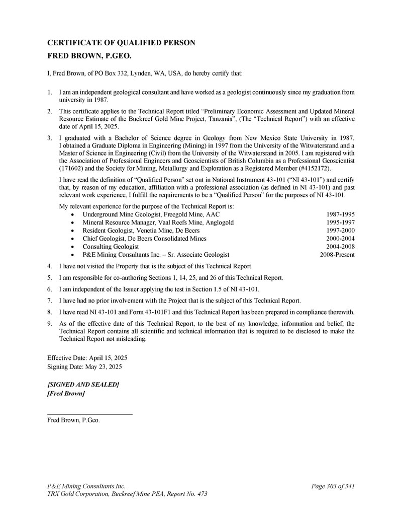 FRED BROWN,P.GEO.合格人员证书。我,Fred Brown,PO Box 332,Lynden,WA,USA,特此证明:1。我是一名独立的地质顾问,自1987年大学毕业后,连续从事地质学家的工作。2.本证书适用于题为“坦桑尼亚Buckreef金矿项目的初步经济评估和更新的矿产资源估算”的技术报告(“技术报告”),生效日期为2025年4月15日。3.我于1987年毕业于新墨西哥州立大学,获得地质学理学学士学位。我于1997年获得威特沃特斯兰德大学工学(采矿)研究生文凭,并于2005年获得威特沃特斯兰德大学工学(土木)理学硕士学位。我在不列颠哥伦比亚省专业工程师和地球科学家协会注册为专业地球科学家(171602),并在采矿、冶金和勘探协会注册为会员(# 4152172)。本人已阅读National Instrument 43-101(“NI 43-101”)中对“合格人员”的定义,并证明,由于本人的学历、与专业协会的隶属关系(如NI 43-101中的定义)和过往的相关工作经验,本人符合NI 43-101中的“合格人员”要求。就技术报告而言,我的相关经历是:地下矿山地质学家,Freegold矿山,Vaal Reefs矿山AAC矿产资源管理师,Anglogold驻厂地质学家,Venetia矿山,De Beers首席地质师,De Beers Consolidated Mines Consulting Geologist P & E Mining Consultants Inc. –高级副地质学家1987-1995 1995-1997 1997-2000 2000-2004 2004-20082008-至今4。我没有访问过本技术报告主题的物业。5.本人负责共同撰写本技术报告第1、14、25、26节。6.我独立于发行人应用NI 43-101第1.5节中的测试。7.我之前没有参与过本技术报告主题的项目。8.我已经阅读了NI 43-101和表格43-101F1,本技术报告是按照这些标准编写的。9.截至本技术报告生效之日,据本人所知、所知及所信,技术报告载有为使技术报告不具误导性而须予披露的所有科技资料。生效日期:2025年4月15日签署日期:2025年5月23日{签字盖章} [ Fred Brown ] Fred Brown,P.Geo。P & E Mining Consultants Inc. TRX Gold Corporation,Buckreef Mine PEA,第473号报告,共341页第303页