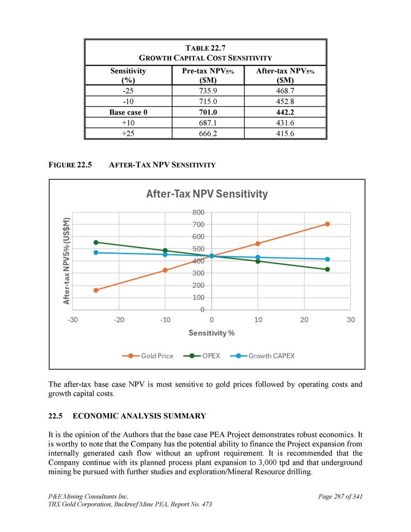 T ABLE 22.7 G ROWTH C APITAL C OST s税后NPV 5%($ M)税前NPV 5%($ M)灵敏度(%)468.77 35.9-25452.87 15.0-10442.2701.0基本情况0431.66 87.1 + 10415.66 66.2 + 25 F IGURE 22.5 A FTER-T AX NPV S有效性税后基本情况NPV对金价最为敏感,其次是运营成本和增长资本成本。22.5经济分析总结作者认为,基本情况PEA项目证明了稳健的经济学。值得注意的是,公司有潜在能力从内部产生的现金流为项目扩张提供资金,而无需预先要求。建议公司继续进行计划中的加工厂扩建至3000吨/日,并通过进一步研究和勘探/矿产资源钻探进行地下采矿。P & E Mining Consultants Inc. TRX Gold Corporation,Buckreef Mine PEA,报告第473页,共341页第287页