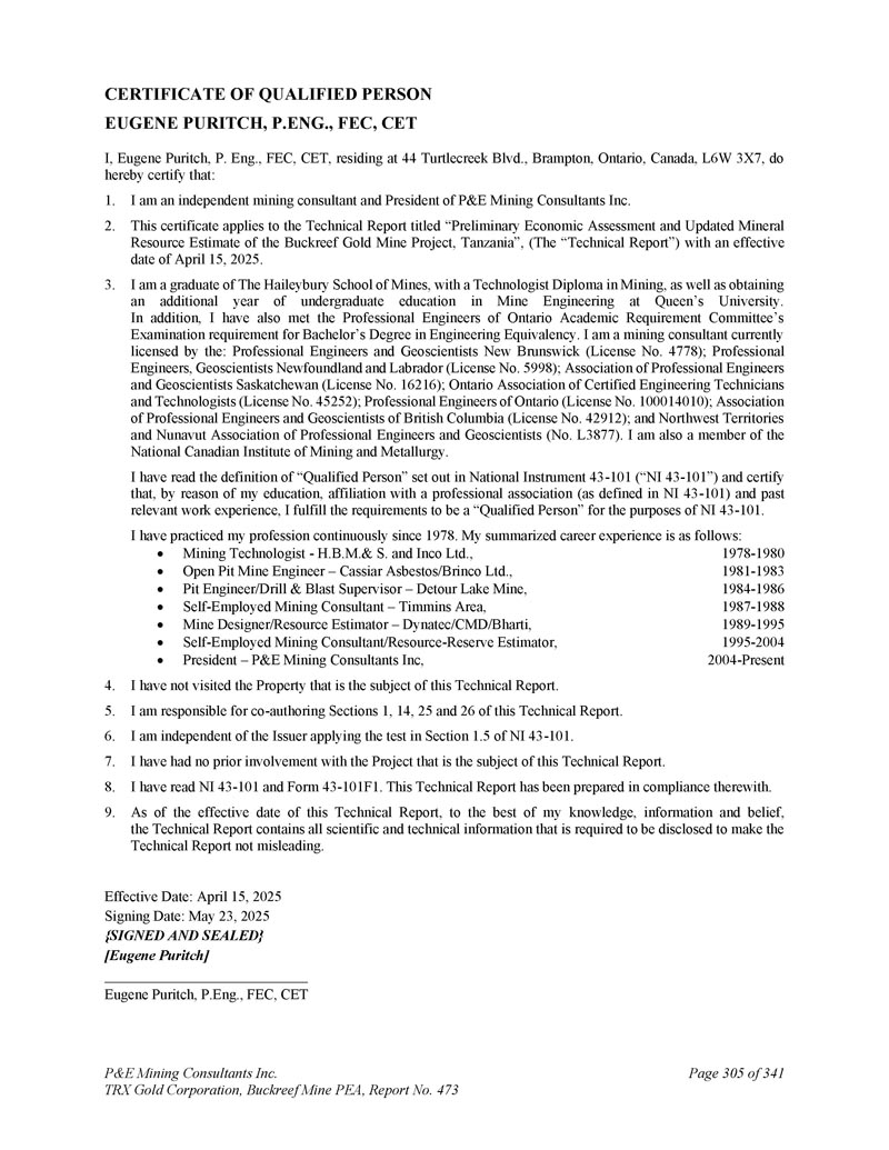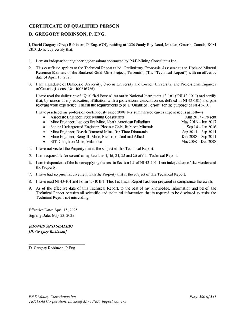 Qualified Person Certificate D. Gregory ROBINSON,P. ENG。I,David Gregory(Greg)Robinson,P. Eng。(on),居住于1236 Sandy Bay Road,Minden,Ontario,Canada,K0M 2K0,兹证明:1。我是P & E Mining Consultants Inc. 2签约的独立工程顾问。本证书适用于题为“坦桑尼亚Buckreef金矿项目的初步经济评估和更新的矿产资源估算”的技术报告(“技术报告”),生效日期为2025年4月15日。3.本人毕业于达尔豪斯大学、皇后大学和康奈尔大学,安大略省专业工程师(执业证号100216726)。本人已阅读National Instrument 43-101(“NI 43-101”)中对“合格人员”的定义,并证明,由于本人的学历、与专业协会的隶属关系(如NI 43-101中所定义)和过去的相关工作经验,本人符合NI 43-101中的“合格人员”要求。自2008年以来,我一直在不断地练习我的专业。我的职业经历总结如下:副工程师,P & E Mining Consultants矿山工程师,Lac des Iles矿山,北美钯金高级地下工程师,凤凰黄金,Rubicon矿产矿山工程师,Diavik钻石矿,力拓钻石矿工程师,Bengalla矿,力拓 Coal和Allied EIT,Creighton矿,淡水河谷-英科2017年8月-现在2016年5月2017年9月14日– 2016年1月2011年9月– 2014年9月2008年12月– 2011年9月2008年5月– 2008年12月4。我没有访问过本技术报告主题的物业。5.本人负责共同撰写本技术报告第1、16、21、25和26节。6.我独立于发行人应用NI 43-101第1.5节中的测试。我独立于卖方和物业。7.我之前没有参与过本技术报告主题的物业。8.我已经阅读了NI 43-101和表格43-101F1。本技术报告是根据该报告编写的。9.截至本技术报告生效之日,据本人所知、所知及所信,技术报告载有为使技术报告不具误导性而须予披露的所有科技资料。生效日期:2025年4月15日签署日期:2025年5月23日{签字盖章} [ D. Gregory Robinson ] D. Gregory Robinson,P.eng。P & E Mining Consultants Inc. TRX Gold Corporation,Buckreef Mine PEA,报告第473页,共341页第306页
