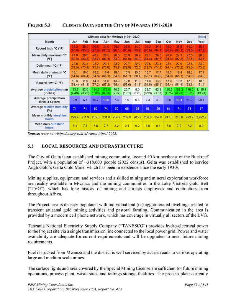 F IGURE 5.3 C LIMATE D ATA for the C ITY of M WANZA 1991-2020来源:www.en. wikipedia.org/wiki/mwanza(2025年4月)5.3当地资源和基础设施Geita市是一个成熟的采矿社区,位于Buckreef项目东北40公里处,人口约为318,600人(2022年人口普查)。Geita的成立是为了服务于AngloGold的Geita金矿,该金矿自1930年代初就已存在。Mwanza和维多利亚湖黄金带(“LVG”)的采矿社区随时可以获得采矿用品、设备和服务以及熟练的采矿和矿产勘探劳动力,该带有着悠久的采矿历史,吸引了来自整个非洲的员工和承包商。项目区域内密布着与临时手工采金活动和田园农业相关的个人和(或)聚集住宅。该地区的通信由现代化的手机网络提供,该网络几乎覆盖了LVG的所有部门。坦桑尼亚国家电力供应公司(简称“TANESCO”)通过一条与当地电网相连的输电线路向项目现场提供水电电力。电力和水的可用性足以满足当前的要求,并将进行升级以满足未来的采矿要求。燃料是从姆万扎用卡车运来的,该地区通过通往各种运营中的大中型矿山的通路得到了很好的服务。特别采矿许可证所涵盖的地面权和面积足够未来采矿作业、加工厂、废品场和尾矿储存设施使用。该加工厂目前P & E Mining Consultants Inc. TRX Gold Corporation,Buckreef Mine PEA,报告第473页,共341页