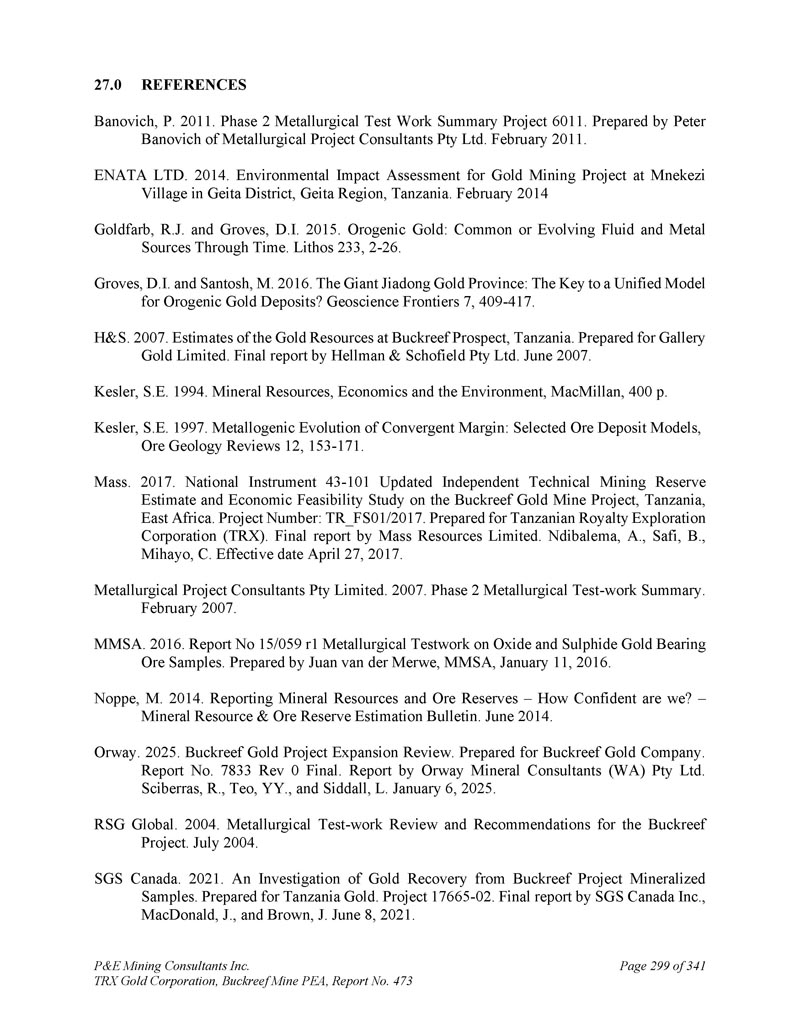 P & E Mining Consultants Inc. TRX Gold Corporation,Buckreef Mine PEA,Report No. 473 page 299 of 34127.0 references Banovich,p. 2011。二期冶金试验工作总结项目6011。Metallurgical Project Consultants Pty Ltd.的Peter Banovich编写,2011年2月。ENATA有限公司。2014 .坦桑尼亚Geita地区Geita区Mnekezi村金矿项目环境影响评价。2014年2月Goldfarb,R. J.和Groves,D. I. 2015。造山金:常见或演化的流体和金属来源穿越时间。利索斯233,2-26。Groves,D. I.和Santosh,M. 2016。巨子嘉东黄金大省:造山金矿床统一模式的关键?地球科学前沿7,409-417。H & S。2007 .坦桑尼亚Buckreef Prospect黄金资源估算。为Gallery Gold Limited做准备。Hellman & Schofield Pty Ltd.的最终报告,2007年6月。Kesler,S.E. 1994年。Mineral Resources,Economics and the Environment,MacMillan,400 p. Kesler,S.E. 1997。收敛边际成矿演化:精选矿床模型,矿石地质评论12,153-171。弥撒。2017 .National Instrument 43-101更新了东非坦桑尼亚Buckreef金矿项目的独立技术采矿储量估算和经济可行性研究。项目编号:TR _ FS 01/2017。为坦桑尼亚版税勘探公司(TRX)准备。Mass Resources Limited的最终报告。Ndibalema,A.,Safi,B.,Mihayo,C.生效日期2017年4月27日。Metallurgical Project Consultants Pty Limited。2007.第2阶段冶金试验-工作总结。2007年2月。MMSA。2016 .报告No 15/059 r 1含氧化物和硫化金矿石样品的冶金试验工作。由MMSA的Juan van der Merwe编写,2016年1月11日。Noppe,M. 2014。报告矿产资源和矿石储量–我们有多大信心?–矿产资源和矿石储量估算公报。2014年6月。奥威。2025 .Buckreef黄金项目扩建审查。为Buckreef黄金公司做准备。报告编号7833 Rev 0 Final。Orway Mineral Consultants(WA)Pty Ltd.报告Sciberras,R.,Teo,YY。,和Siddall,L. 2025年1月6日。RSG全球。2004 .冶金试验-Buckreef项目工作回顾与建议。2004年7月。SGS加拿大。2021 .Buckreef项目矿化样品金回收率调查。为坦桑尼亚黄金做准备。项目17665-02。SGS Canada Inc.,MacDonald,J.和Brown,J.的最终报告,2021年6月8日。