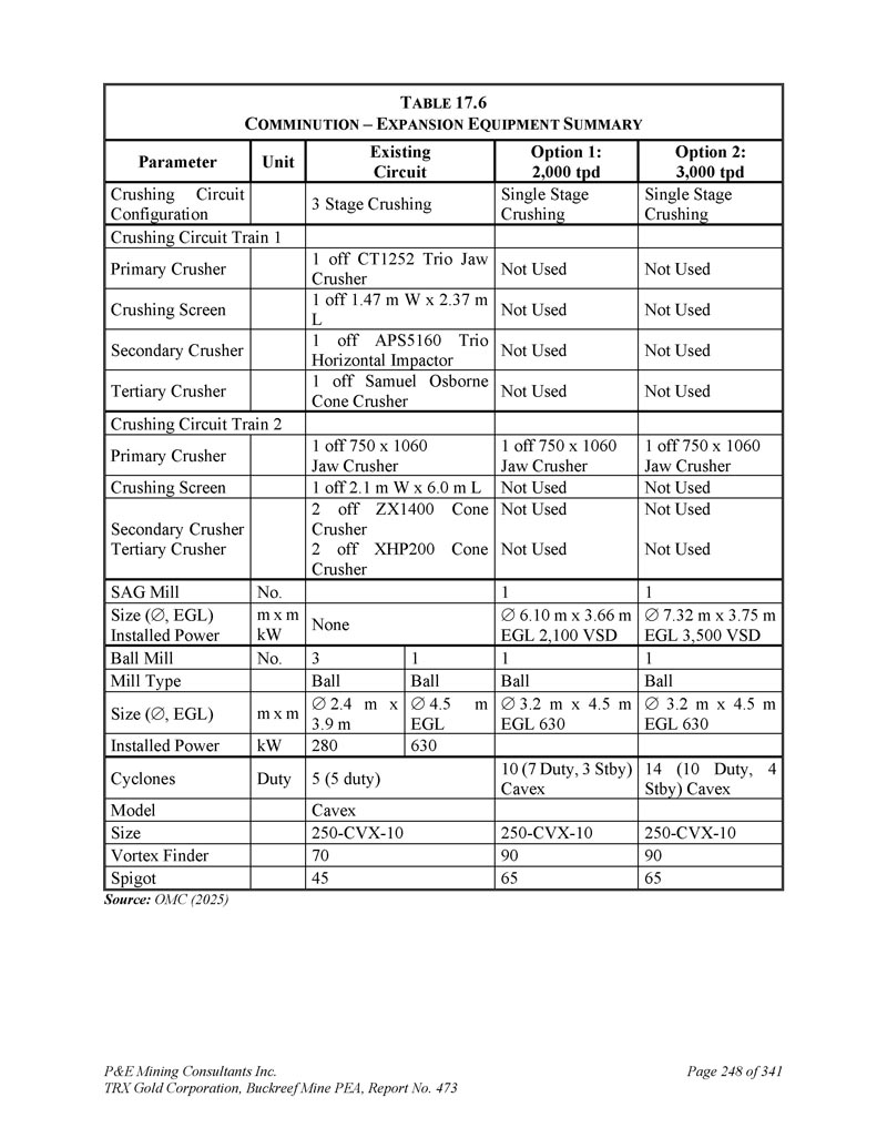 P & E Mining Consultants Inc. TRX Gold Corporation,Buckreef Mine PEA,第473号报告第248页of 341 t ABLE17.6 c OMINUTION – e XPANSION e QUIPMENT s UMMARY Option 2:3000 tpd Option 1:2000 tpd现有电路单元参数单级破碎单级破碎3级破碎破碎电路配置破碎电路列车1未使用未使用1 off CT1252三爪式破碎机一级破碎机未使用1 off 1.47 m W x 2.37 m L破碎屏未使用1 off APS5160三位水平冲击器二级破碎机未使用未使用1 off Samuel Osborne锥破碎机三级破碎机破碎电路列车21关750 x 1060爪破碎机1关750 x 1060爪破碎机1关750 x 1060爪破碎机一级破碎机未使用1关2.1 m W x 6.0 m L破碎屏未使用未使用2关ZX1400锥破碎机2关XHP200锥破碎机二级破碎机三级破碎机11号。SAG磨机7.32 m x 3.75 m EGL3,500 VSD 6.10 m x 3.66 m EGL2,100 VSD无m x m kW尺寸(,EGLL)安装功率1113号球磨机球球球磨机型号3.2 m x 4.5 m EGL6303.2 m x 4.5 m EGL6304.5 m EGL2.4 m x 3.9 m m x m Size(,EGL)630280 kW装机功率14(10 duty,4 stby)Cavex 10(7 duty,3 stby)Cavex 5(5 duty)Duty Cyclones Cavex Model 250-CVX-10250-CVX-10250-丨CVX CVX-10尺寸909070旋涡查找器656545 Spigot来源:OMC(2025)