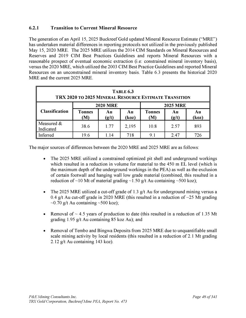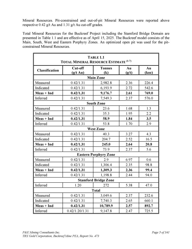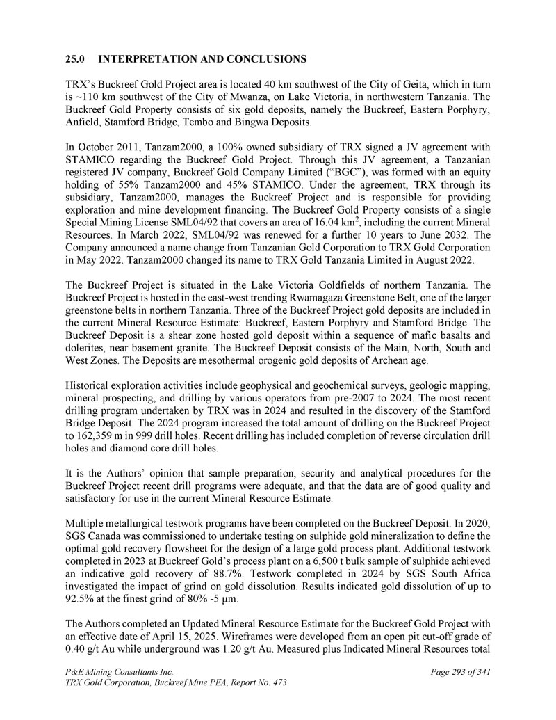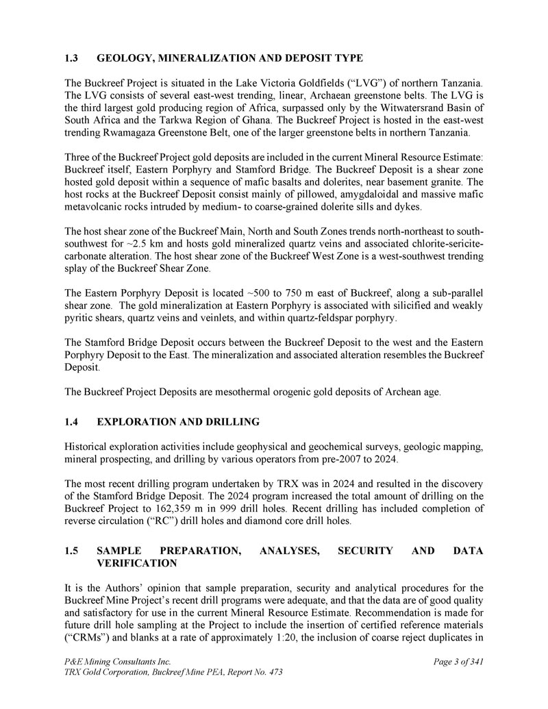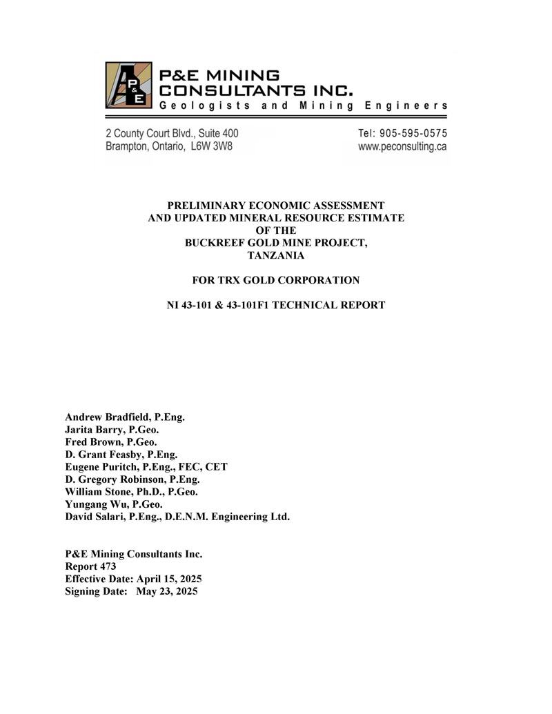 坦桑尼亚BACKREEF金矿项目的初步经济评估和更新的矿产资源估计,用于TRX GOLD CORPORATION NI 43-101 & 43-101F1技术报告Andrew Bradfield,P.Eng。Jarita Barry,P.Geo。弗雷德·布朗,P.Geo。D. Grant Feasby,P.Eng。Eugene Puritch,P.eng.,FEC,CET D. Gregory Robinson,P.eng。William Stone,PH. D.,P. Geo。Yungang Wu,P. Geo。David Salari,P. Eng。,D. E. N. M. Engineering Ltd. P & E Mining Consultants Inc. Report 473生效日期:2025年4月15日签署日期:2025年5月23日