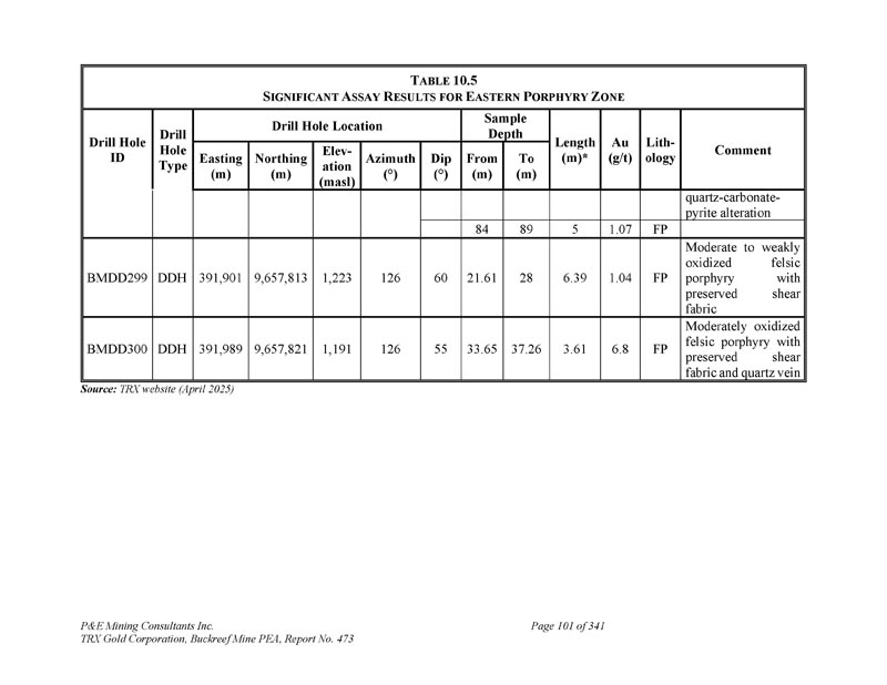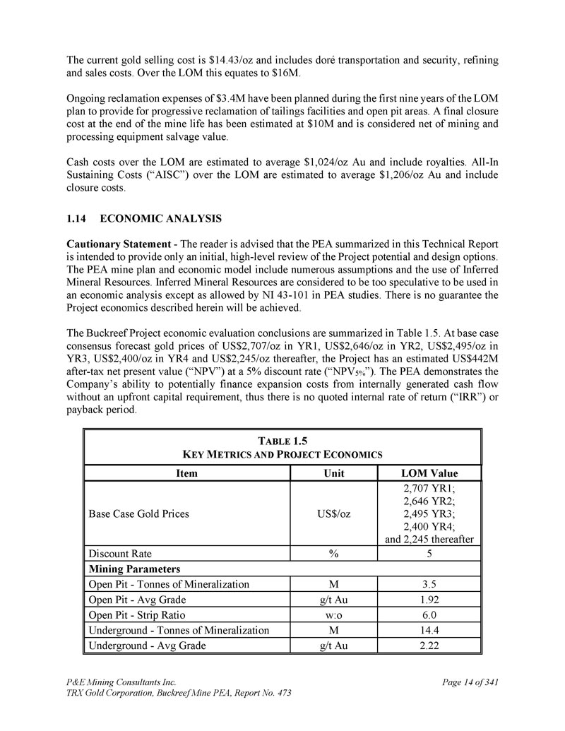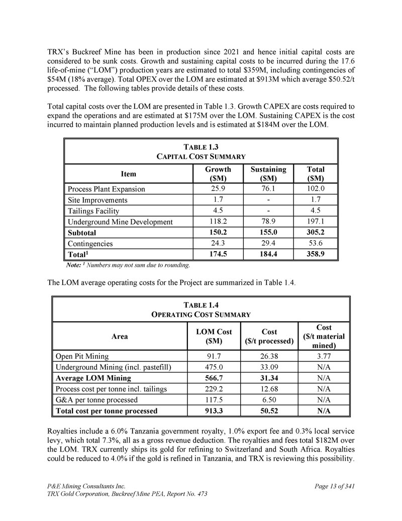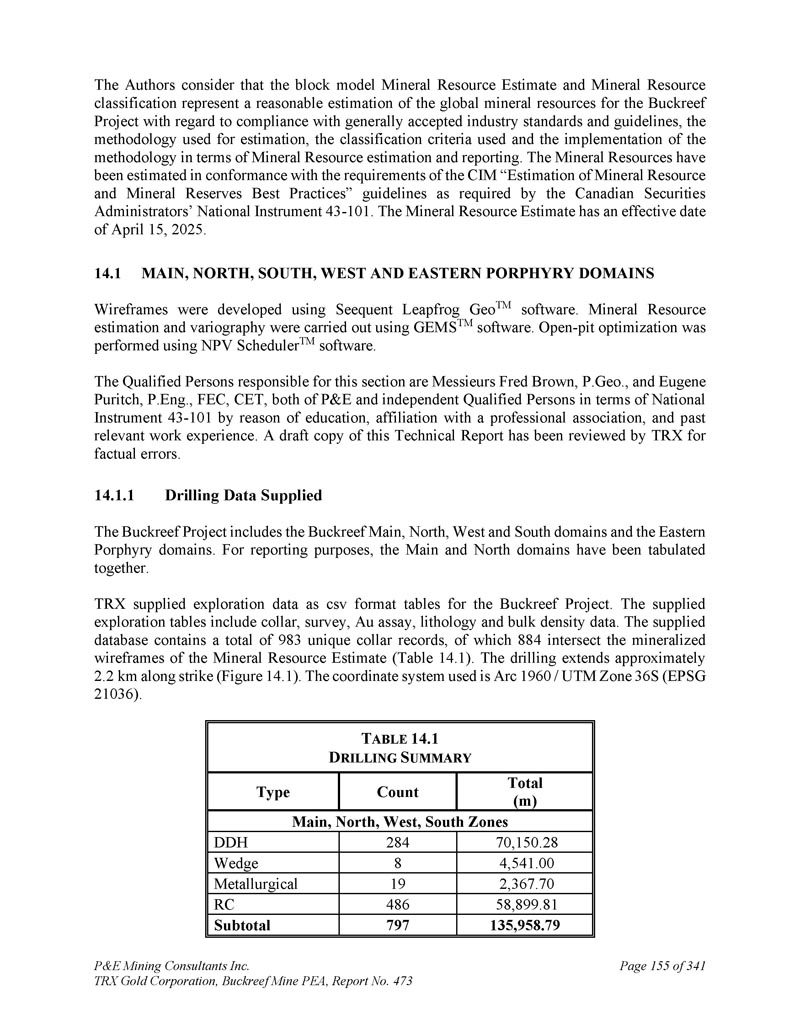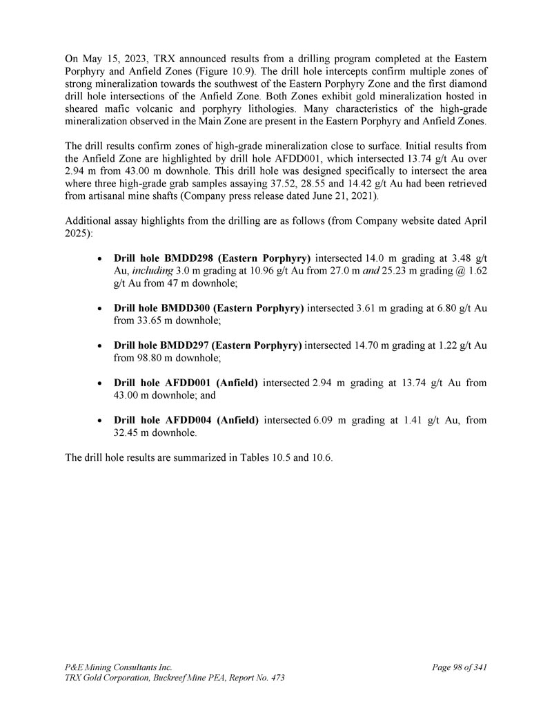 坦桑尼亚BACKREEF金矿项目的初步经济评估和更新的矿产资源估计,用于TRX GOLD CORPORATION NI 43-101 & 43-101F1技术报告Andrew Bradfield,P.Eng。Jarita Barry,P.Geo。弗雷德·布朗,P.Geo。D. Grant Feasby,P.Eng。Eugene Puritch,P.eng.,FEC,CET D. Gregory Robinson,P.eng。William Stone,PH. D.,P. Geo。Yungang Wu,P. Geo。David Salari,P. Eng。,D. E. N. M. Engineering Ltd. P & E Mining Consultants Inc. Report 473生效日期:2025年4月15日签署日期:2025年5月23日