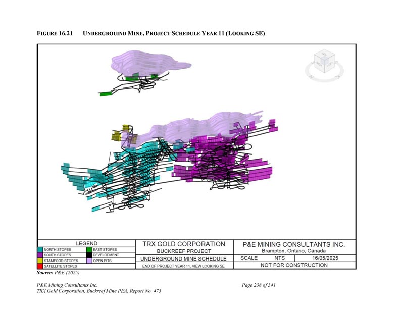 F IGURE 16.21 U NDERGROUIN M INE,P ROJECT S CHEDULE Y EAR 11(L OOKING SE)资料来源:P & E(2025)P & E Mining Consultants Inc. TRX Gold Corporation,Buckreef Mine PEA,报告第473页,共341页第238页