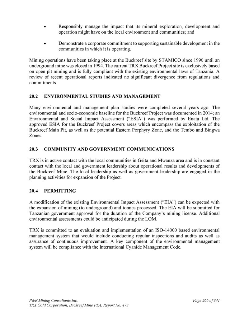 P & E Mining Consultants Inc. TRX Gold Corporation,Buckreef Mine PEA,报告第473号,第341页第266页,负责任地管理其矿产勘探、开发和经营可能对当地环境和社区产生的影响;并表现出企业对支持其经营所在社区可持续发展的承诺。自1990年以来,STAMICO一直在Buckreef矿场进行采矿作业,直到1994年一个地下矿山被关闭。目前的TRX Buckreef项目场地完全以露天采矿为基础,完全符合坦桑尼亚现有的环境法。对最近业务报告的审查表明,与法规和承诺没有重大分歧。2.环境研究和管理许多环境和管理计划研究是几年前完成的。Buckreef项目的环境和社会经济基线于2014年记录在案;Enata Ltd.进行了环境和社会影响评估(“ESIA”)。已批准的Buckreef项目ESIA涵盖的区域包括Buckreef主坑的开采,以及潜在的东部斑岩区,以及Tembo和Bingwa区。3.社区和政府通讯TRX与Geita和Mwanza地区的当地社区保持积极联系,并就Buckreef矿的运营结果和发展与当地和政府领导层保持不断联系。地方领导和政府领导都在参与项目扩建的规划活动。4.随着采矿(向地下)和加工吨数的扩大,允许修改现有的环境影响评估(“环评”)是可以预期的。该环境影响评估将在公司采矿许可证有效期内提交坦桑尼亚政府批准。预计将在LOM期间进行更多的环境评估。TRX致力于评估和实施基于ISO-14000的环境管理体系,其中包括进行定期检查和审计以及持续改进的保证。环境管理体系的一个关键组成部分将是遵守国际氰化物管理规范。