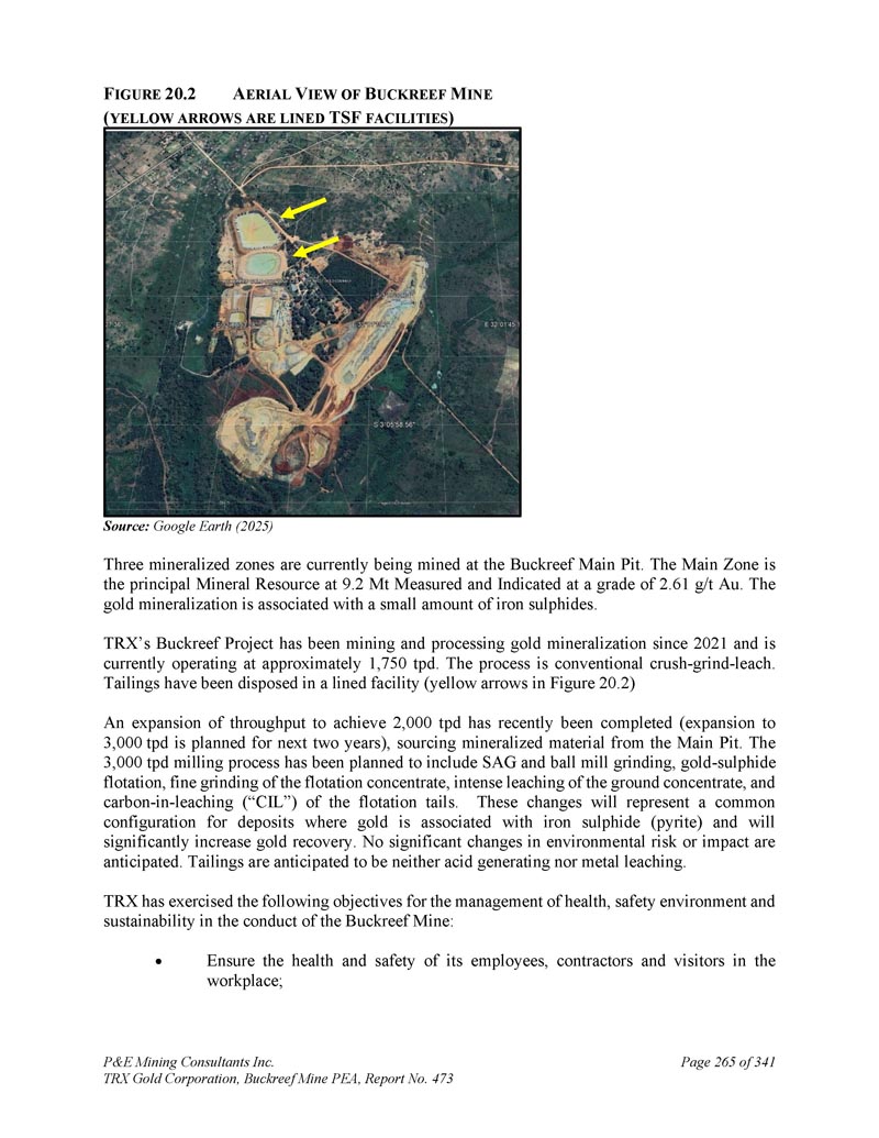 F IGURE 20.2 A ERIAL V IEW of B UCKREEF M INE(YELLOW ARROWS are LINed TSF Facilities)来源:Google Earth(2025)Buckreef主坑目前正在开采三个矿化带。主区是主要矿产资源在9。2公吨实测,标示为2级。61克/吨金。金矿化伴生少量硫化铁。TRX的Buckreef项目自2021年以来一直在开采和加工金矿化,目前的开工率约为1,750吨/日。该工艺为常规破碎-研磨-浸出。尾矿已在有衬里的设施中处置(图20中的黄色箭头。2)近期已完成一次扩大吞吐量以实现2000吨/日(计划未来两年扩大至3000吨/日),从主坑采购矿化材料。3000tpd的铣削工艺计划包括SAG和球磨机研磨、硫化金浮选、浮选精矿精磨、地面精矿的剧烈浸出以及浮选尾的碳中浸出(“CIL”)。这些变化将代表黄金与硫化铁(硫铁矿)伴生的矿床的常见配置,并将显着提高黄金回收率。预计环境风险或影响不会发生重大变化。预计尾矿既不会产酸也不会浸出金属。TRX在Buckreef矿山的行为中对健康、安全环境和可持续性的管理行使了以下目标:确保其员工、承包商和工作场所访客的健康和安全;P & E Mining Consultants Inc. 丨TRX Gold Corporation,Buckreef Mine PEA,第473号报告,共341页第265页