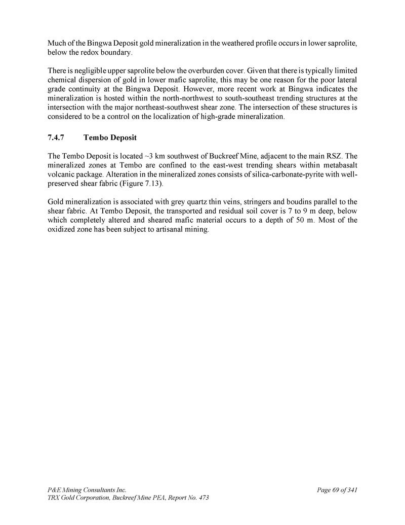 P & E Mining Consultants Inc. TRX Gold Corporation,Buckreef Mine PEA,报告第473号,341页第69页风化剖面中的Bingwa矿床金矿化大部分发生在下部腐泥土中,低于氧化还原边界。覆盖层覆盖层下方的上部腐泥土可以忽略不计。鉴于下镁铁质腐泥土中金的化学分散度通常有限,这可能是冰洼矿床横向品位连续性较差的一个原因。然而,冰洼最近的工作表明,该矿化位于与主要东北-西南剪切带交汇处的北-西北-南-东南走向构造内。这些构造的交集被认为是对高品位矿化局部性的控制。7.4.7 Tembo矿床Tembo矿床位于Buckreef矿西南约3公里处,毗邻主要的RSZ。Tembo的矿化带局限于偏玄武岩火山包内的东西走向剪切带。矿化带的蚀变由二氧化硅-碳酸盐-黄铁矿和保存完好的剪切织物组成(图7。13 ) .金矿化伴生于与剪切织物平行的灰色石英细脉、纵梁和布丁。在Tembo矿床,输送和残留土层深度为7至9米,在其下发生完全蚀变和剪切的镁铁质材料深度为50米。大部分氧化区都进行了手工开采。