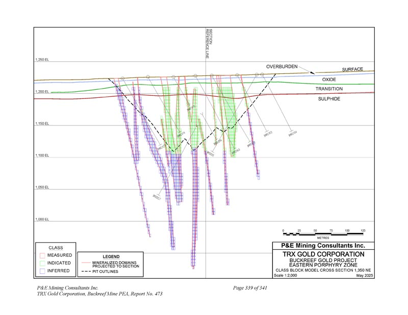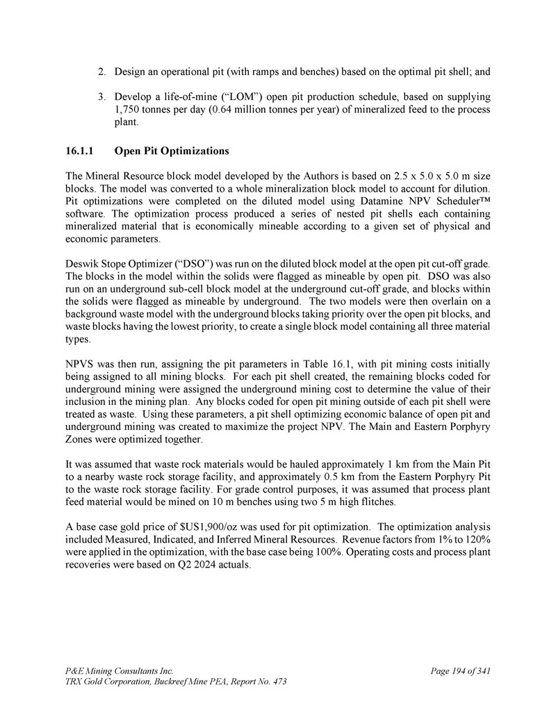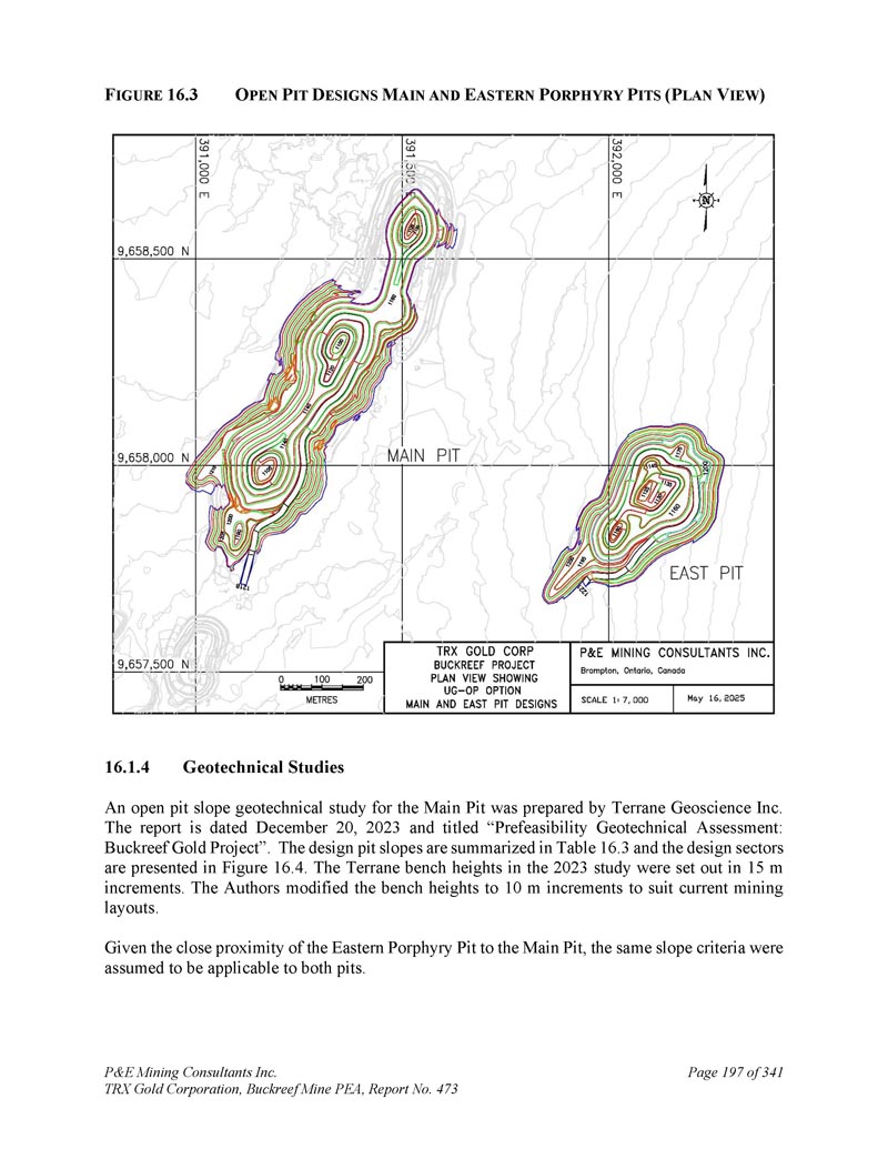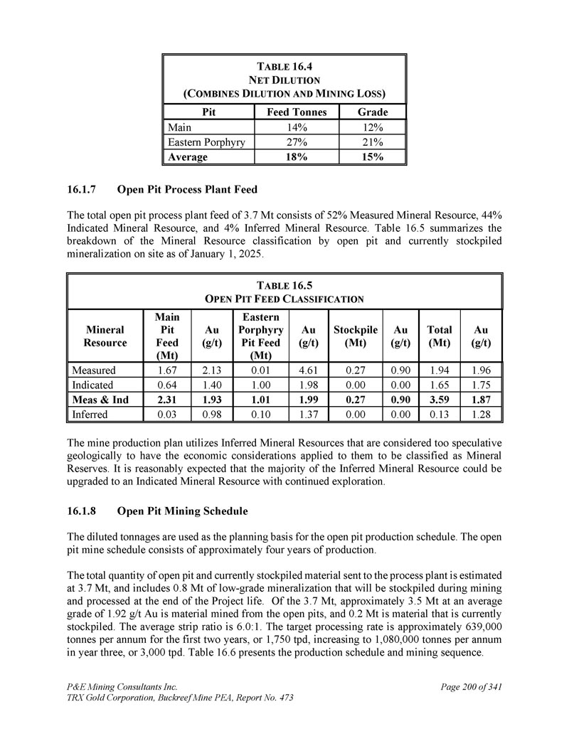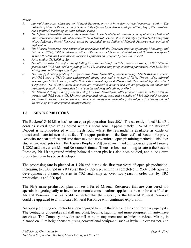 P & E Mining Consultants Inc. TRX Gold Corporation,Buckreef Mine PEA,报告第473期,共341页第6页注:1。矿产资源,不是矿产储量,可能没有显示出经济可行性。矿产资源的估算可能会受到环境、许可、法律、所有权、税收、社会政治、营销或其他相关问题的重大影响。该估算中的推断矿产资源的置信度低于应用于指示矿产资源的置信度,不得转换为矿产储量。合理预期,随着继续勘探,大部分推断矿产资源可升级为指示矿产资源。矿产资源是根据加拿大矿业、冶金和石油学会(CIM)、CIM关于矿产资源和储量的标准、定义和指南进行估算的,该标准由CIM储量定义常设委员会编制,并由CIM理事会通过。使用的价格为1,900美元/盎司金。坑约束边界品位0。42 g/t AU由80%工艺回收所得,21美元。04/tonne工艺和G & A成本,以及7的特许权使用费。3 % .约束坑优化参数为3美元。88/t的开采成本和45度的坑坡。出坑截止品位1。31 g/t AU由80%工艺回收所得,21美元。04/tonne工艺和G & A成本,40美元/tonne地下开采成本,特许权使用费7。3 % .在约束坑壳下方和约束矿化线框内对矿坑外矿产资源品位区块进行量化。矿坑外矿产资源限于地质连续性和合理开采潜力的采填、长孔开采方式开采的区域。斯坦福桥断面等级1。20g/t AU由80%工艺回收所得,21美元。04/tonne工艺和G & A成本,35美元/tonne地下开采成本,特许权使用费7。3 % .矿产资源限制在具有地质连续性和合理开采潜力的采填、长孔地下开采方式开采的区域。2.3.4.5.6.7.1.8采矿方法Buckreef金矿自2021年以来一直为露天矿作业。目前开采的主坑包含几条位于剪切带内的金脉。Buckreef矿床大约80%是硫化物-寄主在新鲜的岩石中,而其余的则可作为氧化物或地表附近的过渡材料。Buckreef和东部斑岩矿床的上部靠近地表,适合常规的露天采矿方法。该PEA根据截至2025年1月1日的矿坑地形和当前的矿产资源估算,研究了两个露天矿坑(主坑、东部斑岩坑)。东部斑岩矿坑迄今没有采矿。还研究了露天矿坑以下的地下开采,制定了长期生产计划。计划在露天矿生产的前两年,处理率为1,750吨/日,在YR 3(第三年)增加到3,000吨/日。YR 4完成露天采矿。地下开发计划在YR 3开始,并在两年内爬坡,以便到YR 5生产在3000吨/日。PEA矿山生产计划利用了推断的矿产资源,这些资源在地质上被认为过于投机,无法将对其适用的经济考虑归类为矿产储量。合理预期,随着继续勘探,大部分推断矿产资源可升级为指示矿产资源。一家露天采矿承包商已受聘开采主要和东部斑岩露天矿坑。承包商承担所有钻爆、装载、拖运、矿山设备维护活动。该公司提供全面的矿山管理和技术服务。在10米高的工作台上规划采矿,使用液压挖掘机等常规设备,并