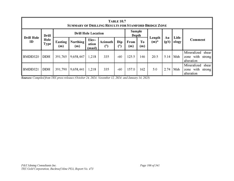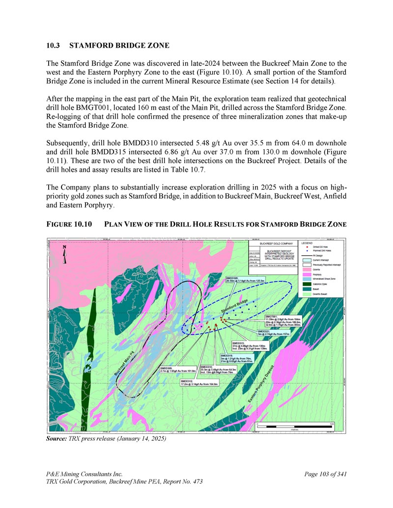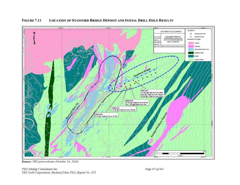F IGURE 7.11 L Ocation of S TANFORD B RIDGE D EPOSIT和I NITIAL D RIL H OLE R ESULTS来源:TRX新闻稿(2024年10月24日)P & E Mining Consultants Inc. 丨TRX Gold Corporation,Buckreef Mine PEA,第473号报告,第341页第67页