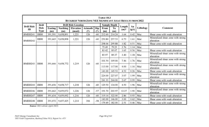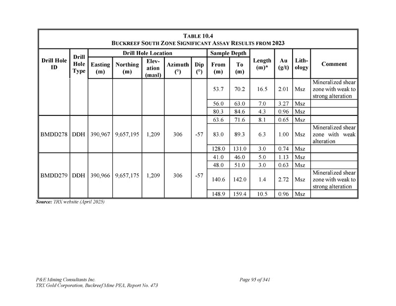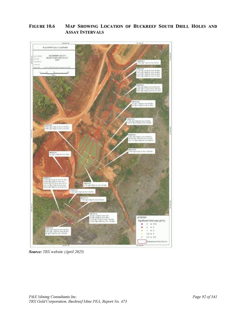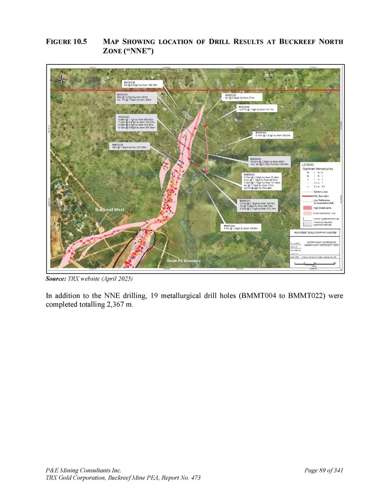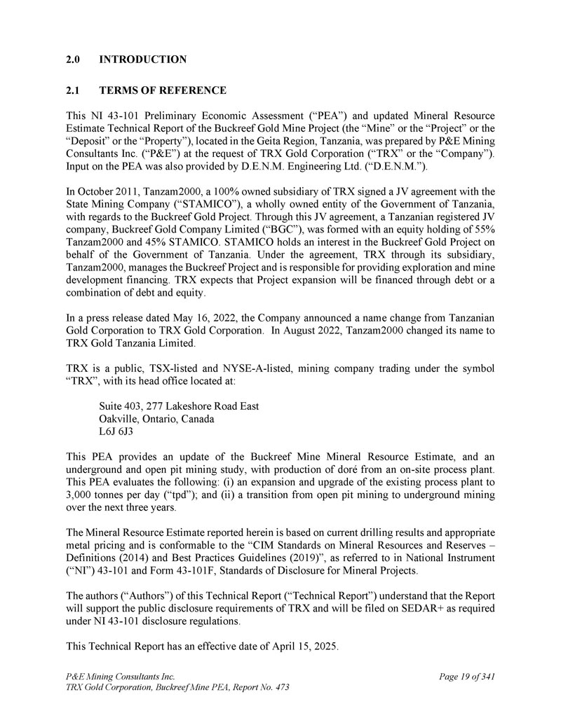 P & E Mining Consultants Inc. TRX Gold Corporation,Buckreef Mine PEA,第473号报告,共3411页第19页。导言2。职权范围这份位于坦桑尼亚Geita地区的Buckreef金矿项目(“矿山”或“项目”或“矿床”或“财产”)的NI 43-101初步经济评估(“PEA”)和更新的矿产资源估算技术报告,由P & E Mining Consultants Inc.(“P & E”)应TRX黄金公司(“TRX”或“公司”)的要求编制。PEA上的输入也由D. E. N. M. Engineering Ltd.(“D. E. N. M.”)提供。2011年10月,TRX 100%拥有的子公司Tanzam 2000就Buckreef黄金项目与坦桑尼亚政府的全资实体State Mining Company(“STAMICO”)签署了合资协议。通过该合资协议,组建了坦桑尼亚注册合资公司Buckreef Gold Company Limited(“BGC”),持股55% Tanzam 2000和45% STAMICO。STAMICO代表坦桑尼亚政府持有Buckreef黄金项目的权益。根据协议,TRX通过其子公司Tanzam 2000管理Buckreef项目并负责提供勘探和矿山开发融资。TRX预计,项目扩建将通过债务或债务和股权相结合的方式融资。在2022年5月16日的新闻稿中,该公司宣布将名称从Tanzanian Gold Corporation更改为TRX黄金公司。2022年8月,Tanzam 2000更名为TRX Gold Tanzania Limited。TRX是一家上市、在多伦多证券交易所上市和在纽约证券交易所-A上市的矿业公司,交易代码为“TRX”,其总部位于:Suite 403,277 Lakeshore Road East Oakville,Ontario,Canada L6J 6J3该PEA提供了Buckreef矿山矿产资源估算的更新,以及地下和露天采矿研究,由现场加工厂生产dor é。这份PEA评估如下:(i)将现有加工厂扩建和升级至每天3000吨(“tpd”);(ii)在未来三年内从露天采矿过渡到地下采矿。本文报告的矿产资源估算基于当前的钻探结果和适当的金属定价,符合“CIM矿产资源和储量标准–定义(2014)和最佳做法指南(2019)”,如National Instrument(“NI”)43-101和表格43-101 F,矿产项目披露标准中所述。本技术报告(“技术报告”)的作者(“作者”)了解,该报告将支持TRX的公开披露要求,并将根据NI 43-101披露法规的要求在SEDAR +上进行备案。本技术报告生效日期为2025年4月15日。