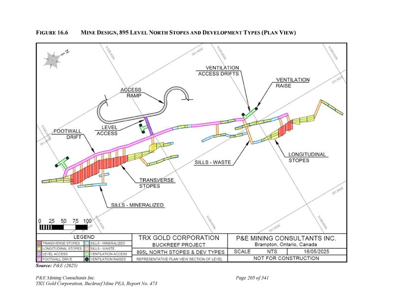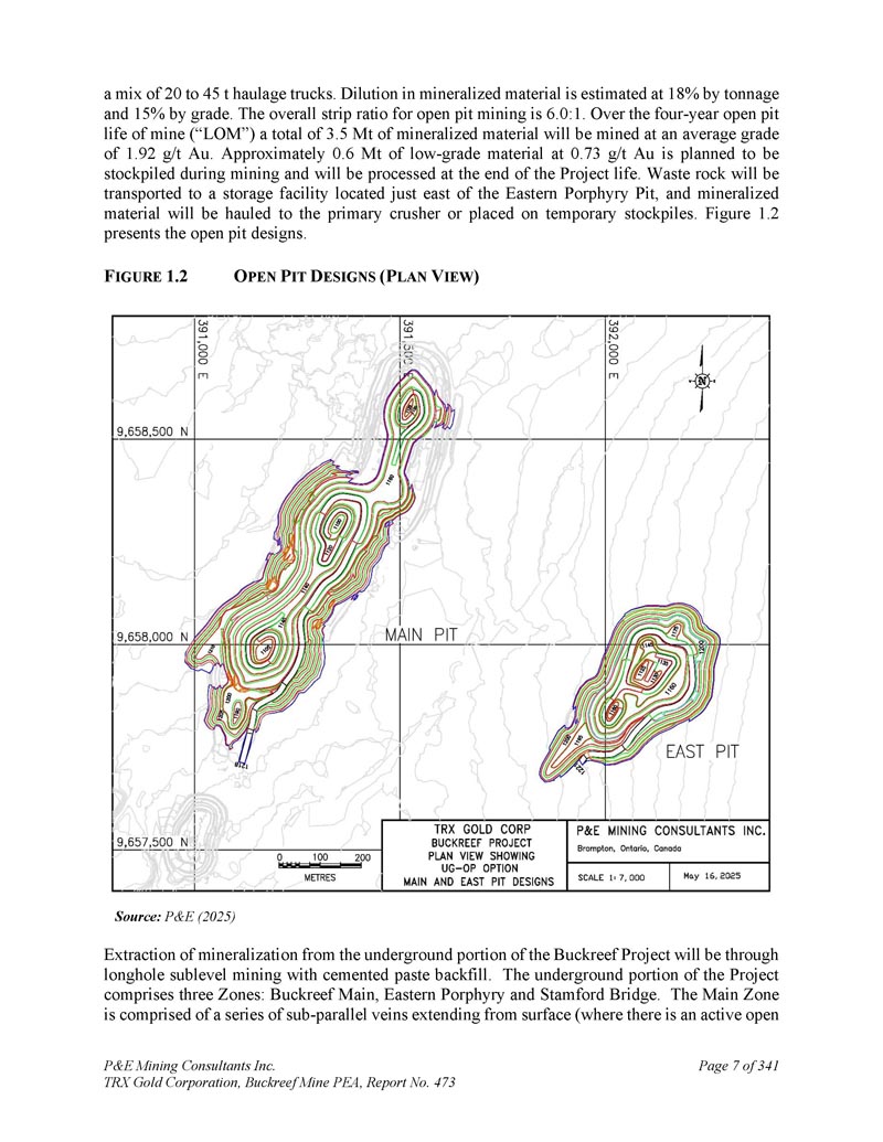 20至45吨运输卡车的混合。矿化材料中的稀释度按吨位估计为18%,按品位估计为15%。露天开采整体带钢比为6。0 : 1 .矿山(“LOM”)四年以上露天开采年限共计3。将以平均品位1开采5公吨矿化材料。92克/吨金。约为0。6公吨低品料0。73克/吨金计划在采矿期间进行储存,并将在项目寿命结束时进行处理。废石将被运送到位于东部斑岩矿坑以东的一个储存设施,矿化材料将被拖到初级破碎机或放置在临时库存中。图1。2展示了露天矿坑设计。F IGURE 1。2 O PEN P IT D ESIGNS(P LAN V IEW)来源:P & E(2025)Buckreef项目地下部分的矿化提取将通过长孔次层法开采,采用胶结浆回填。该项目的地下部分包括三个区域:Buckreef Main、东部斑岩和斯坦福桥。主要区域由一系列从地表延伸的亚平行矿脉组成(其中有一个活跃的开放P & E Mining Consultants Inc. TRX Gold Corporation,Buckreef Mine PEA,报告编号473,共341页第7页