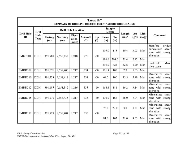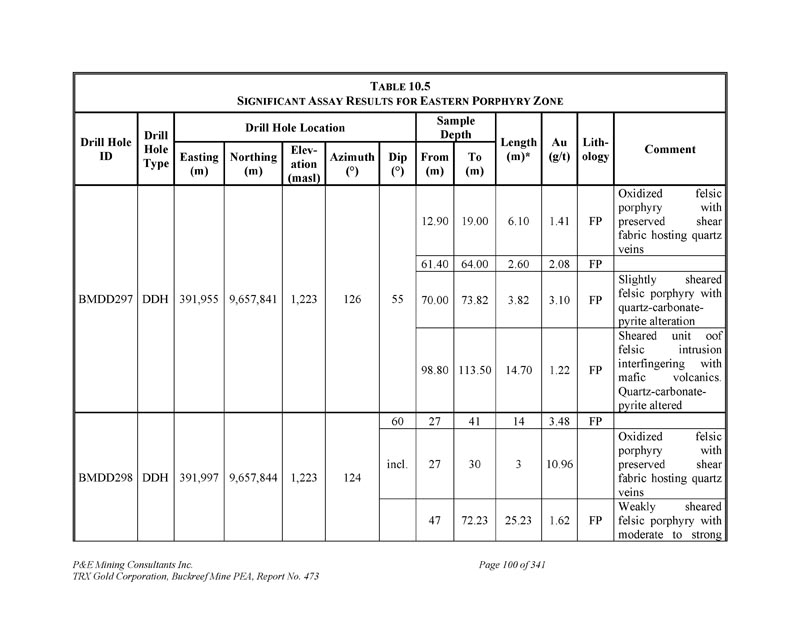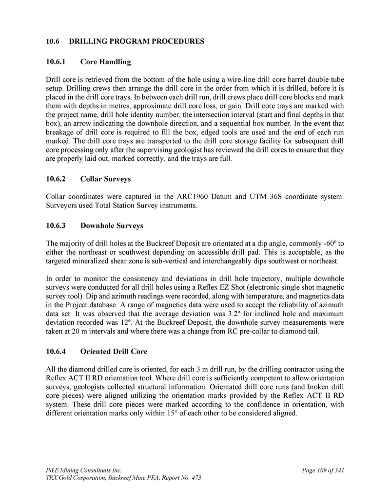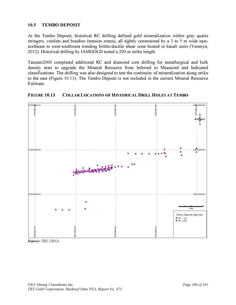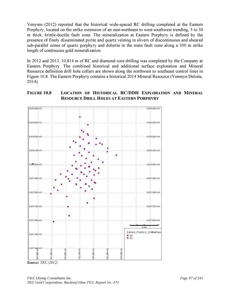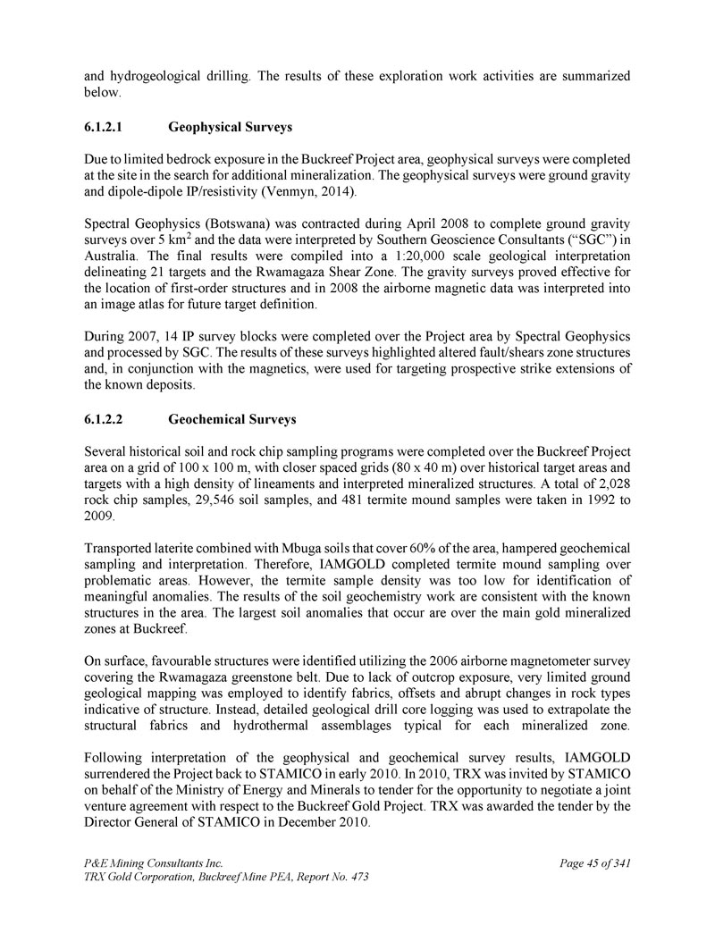 P & E Mining Consultants Inc. TRX Gold Corporation,Buckreef Mine PEA,第473号报告,共341页第45页和水文地质钻探。这些勘探工作活动的成果总结如下。1.地球物理调查由于Buckreef项目区的基岩暴露有限,在现场完成了地球物理调查,以寻找更多的矿化。地球物理调查是地面重力和偶极-偶极IP/电阻率(Venmyn,2014)。Spectral Geophysics(Botswana)于2008年4月签订合同,完成5公里2以上的地面重力调查,数据由澳大利亚的南方地球科学顾问公司(“SGC”)进行解释。最终成果汇编成1:20000比例的地质解释,划定21个目标和Rwamagaza剪切带。重力调查证明对一阶结构的定位有效,2008年,机载磁数据被解释为图像图集,用于未来的目标定义。2007年期间,由光谱地球物理学在项目区上空完成了14个IP调查区块,并由SGC进行了处理。这些调查的结果突出了蚀变断层/剪切带结构,并与磁学一起用于瞄准已知矿床的预期走向延伸。2.地球化学调查在Buckreef项目区域上空以100x100m的网格完成了几个历史土壤和岩屑采样程序,在具有高密度线条和解释矿化结构的历史目标区域和目标上采用更近间距的网格(80x40m)。1992-2009年共采集岩屑样本2,028个,土壤样本29,546个,白蚁丘样本481个。运输的红土与覆盖该地区60%的姆布加土壤相结合,阻碍了地球化学采样和解释。因此,IAMGOLD完成了对问题区域的白蚁丘采样。然而,白蚁样本密度太低,无法识别有意义的异常。土壤地球化学工作的结果与该地区已知的结构一致。最大的土壤异常发生在Buckreef的主要金矿化带上空。在地表,利用2006年覆盖Rwamagaza绿岩带的机载磁强计调查确定了有利的结构。由于缺乏露头暴露,采用了非常有限的地面地质测绘来识别表明结构的织物、偏移和岩石类型的突然变化。取而代之的是,使用详细的地质钻芯测井来推断每个矿化带典型的结构结构和热液组合。根据对地球物理和地球化学调查结果的解释,IAMGOLD于2010年初将该项目交还给STAMICO。2010年,TRX应STAMICO的邀请代表能源部和Minerals部招标,争取关于Buckreef黄金项目的合资协议谈判机会。TRX于2010年12月获得STAMICO总干事的招标。