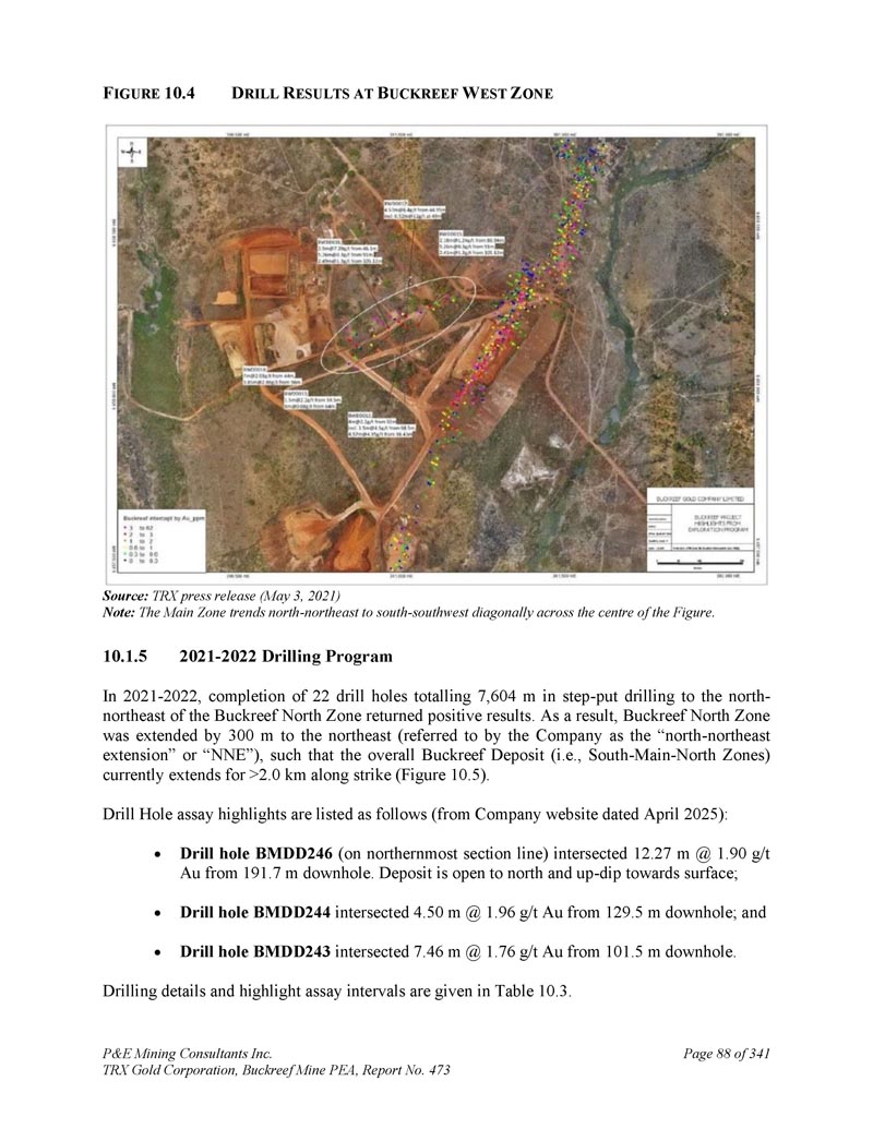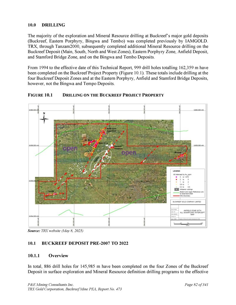10.0钻探Buckreef主要金矿(Buckreef、Eastern Porphyry、Bingwa和Tembo)的大部分勘探和矿产资源钻探此前由IAMGOLD完成。TRX随后通过Tanzam 2000,在Buckreef矿床(主、南、北和西区域)、东部斑岩带、Anfield矿床和Stamford Bridge带以及Bingwa和Tembo矿床上完成了额外的矿产资源钻探。自1994年至本技术报告生效日期,Buckreef项目物业已完成999个钻孔,共162个,359米(图10。1 ) .这些总数包括在四个Buckreef矿床区域以及东部斑岩、安菲尔德和斯坦福桥矿床的钻探,但不包括Bingwa和Tempo矿床。F IGURE 10。B UCKREEF P ROJECT P ROPERTY上的1D RILING来源:TRX网站(2025年5月8日)1。Buckreef Deposit PRE-2007至2022年1。总体而言,在Buckreef矿床的四个区域的地面勘探和矿产资源定义钻探计划中,已向有效的P & E Mining Consultants Inc. TRX Gold Corporation,Buckreef Mine PEA,第473号报告完成了886个钻孔,总长度为145,985 m,共341页