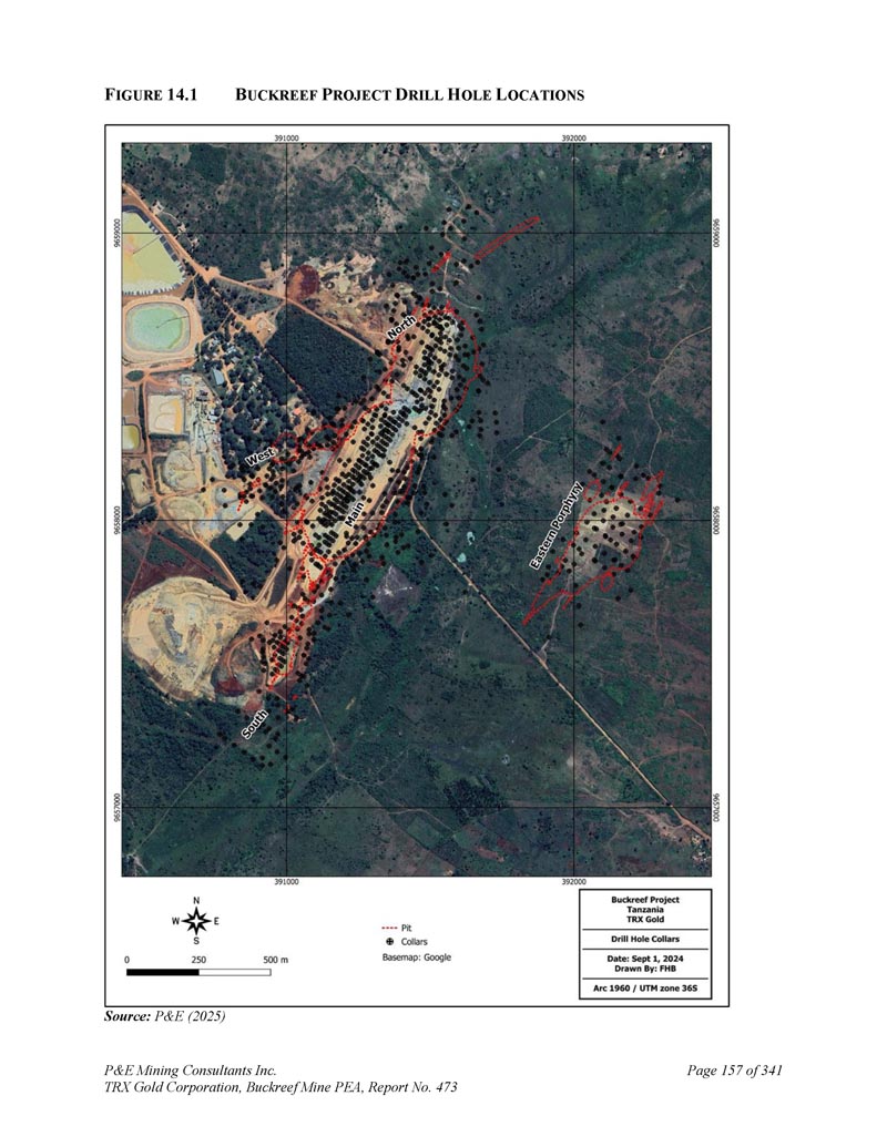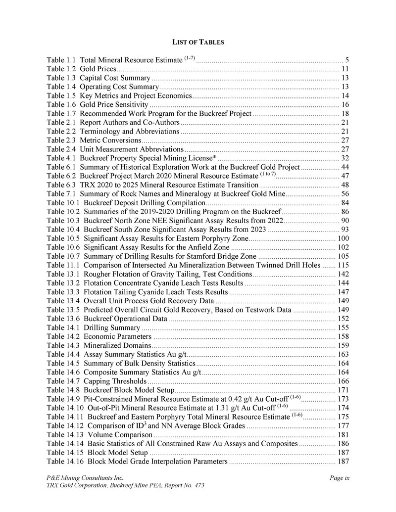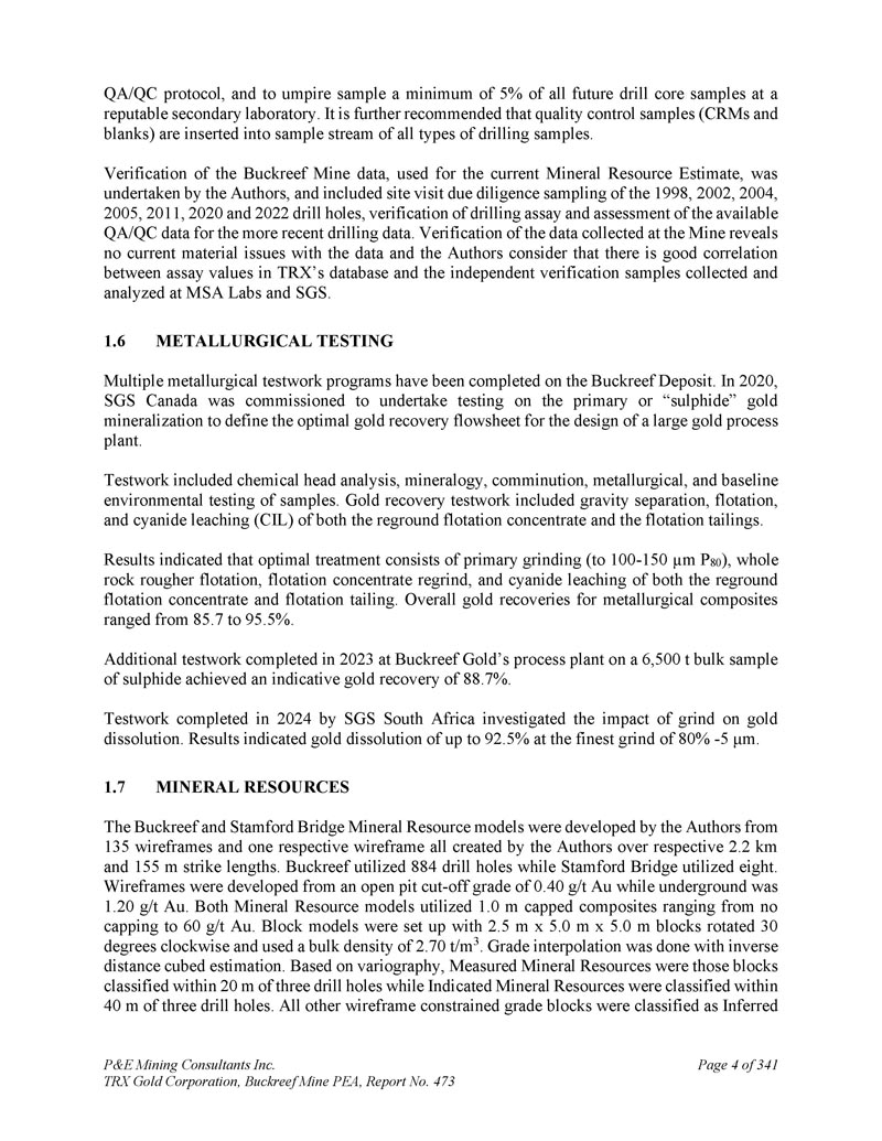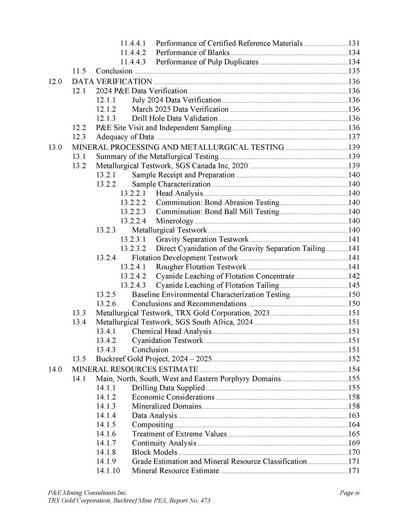 P & E Mining Consultants Inc. TRX Gold Corporation,Buckreef Mine PEA,第473号报告,第4页。经认证的参考资料的性能......................13 12。毛坯的性能.................................................................... 1343。纸浆复制品的性能....................................................1 3411.5结论...................................................................................................1 351。数据核查....................................................................................................1 362。2024年P & E数据验证......................................................................................1 3612.1.11 2.1.21 2.1.3 2024年7月数据验证.......................................................................1 362025年3月数据验证.......................................................1 36钻孔数据验证....................................................1 362。P & E现场访问和独立采样..................................................................1 363。数据的充分性....................................................................................................1 371。矿物加工和冶金检测......................................13 92.。冶金检测汇总......................................................................1 393。冶金测试工作,SGS Canada Inc,2020年...................................................13 913.2.11 3.2.2样品接收和制备......................................................140样品表征......................................................................1 4013.2. 2.11 3.2.21 3.2. 2.31 3.2. 2.4头部分析......................................................................1 40粉碎:粘结磨损测试..................................................1 40粉碎:粘结球磨机测试......................................................1 4013.2.3冶金测试......................................................................1 4013.2. 3.11 3.2. 3.2重力分离尾矿直接氰化测试......................................................1 4113.2.4浮选开发测试工作......................................................1 4113.2.4.11 3.2.4.21 3.2.4.3浮选试验粗糙度......................................................1 41氰化物浸出浮选精矿Metallurgical Testwork,TRX黄金公司,2023......................................15 14。冶金测试工作,SGS南非,2024年....................................................15113.4.11 3.4.21 3.4.3化学头部分析......................................................................15 1氰化测试工作......................................................15 1结论....................................................................15113.5 Buckreef Gold Project,2024 – 2025年....................................................................1521。矿产资源概算..................................................................................1542。主要、北部、南部、西部和东部斑岩域.................................1551。提供钻井数据......................................................................................1552。经济考虑.................................................................... 1583.。矿化域......................................................................... 1584.。数据分析.................................................................................... 1635。合成....................................................................................1646。极端价值观的处理......................................................................1657。连续性分析...................................................................................1 698。Block型号...................................................................................................................17 09。品位估算与矿产资源分类....................17 110.。矿产资源估算......................................................................17 1