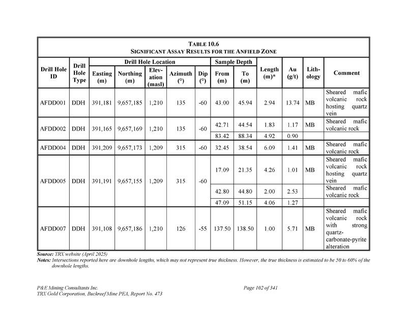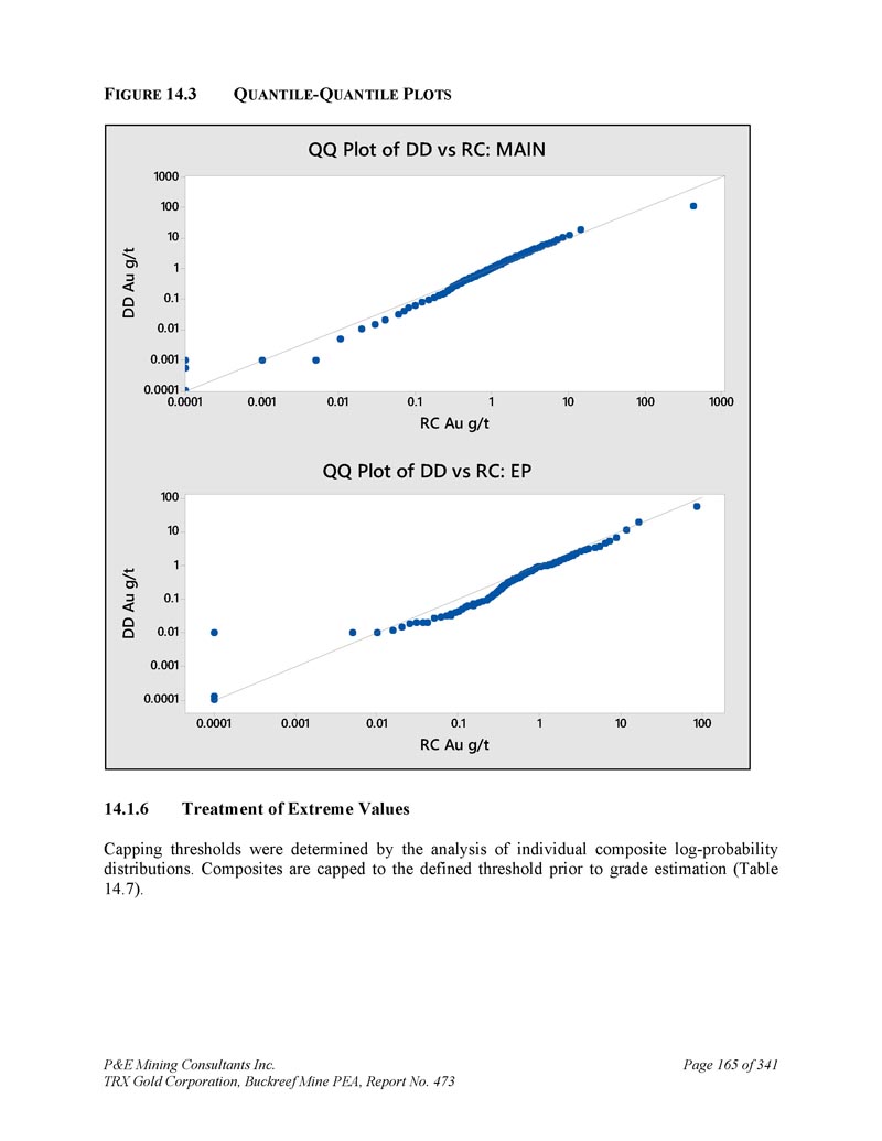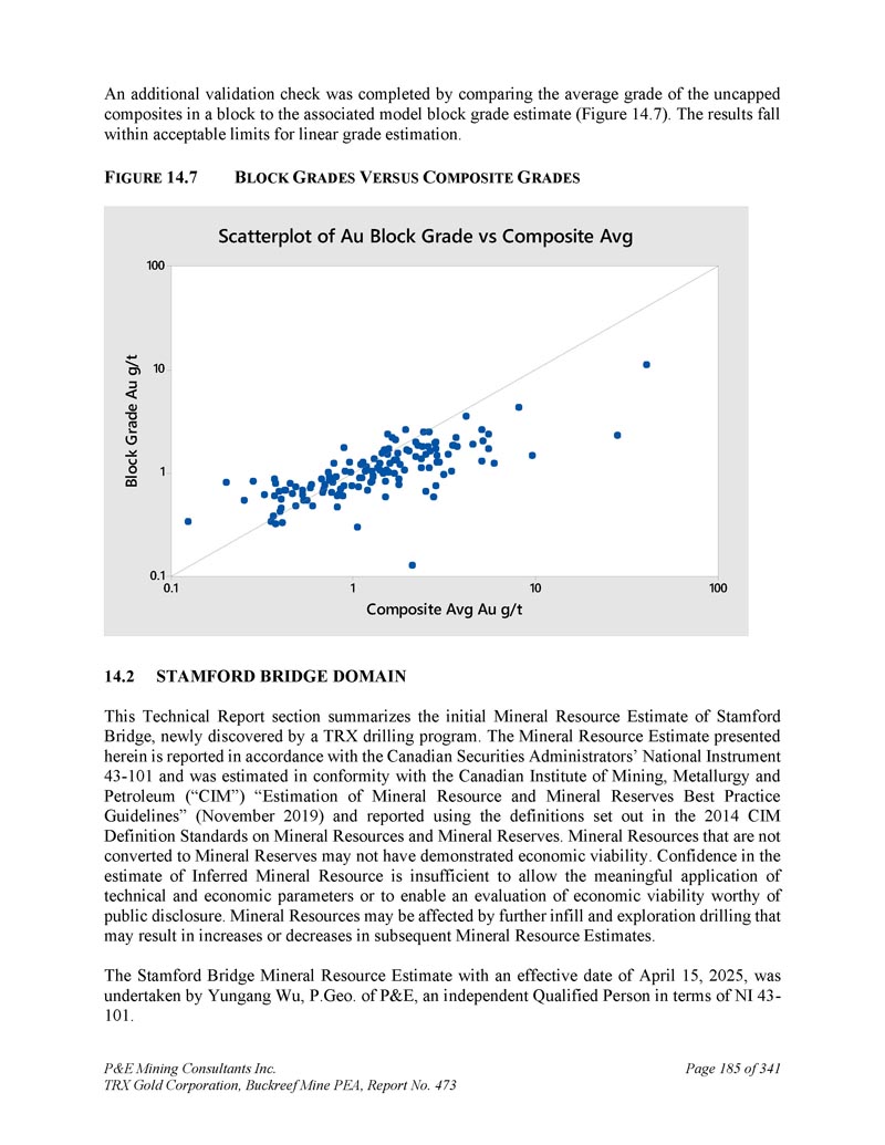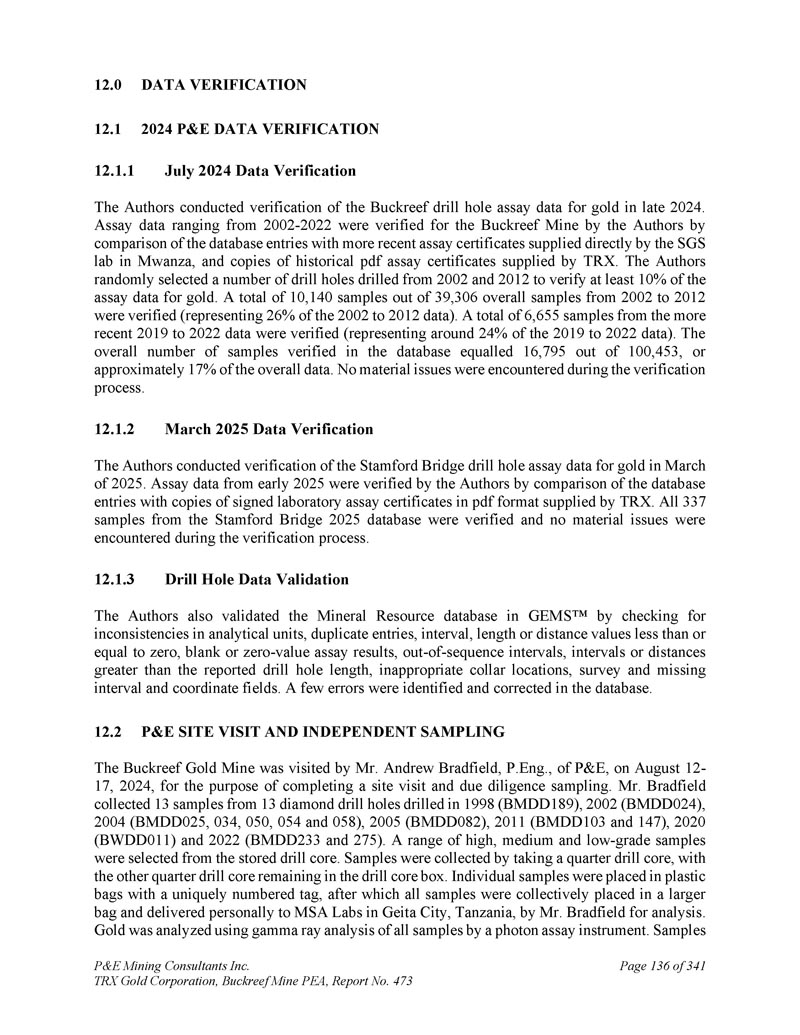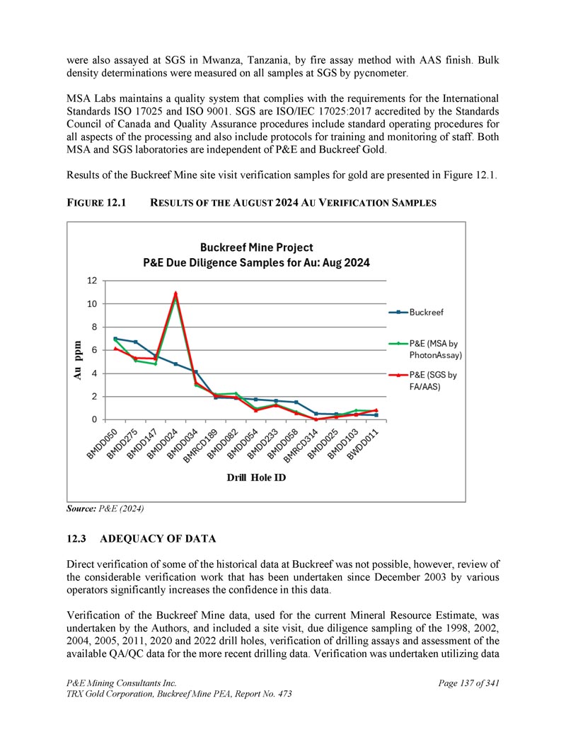 P & E Mining Consultants Inc. TRX Gold Corporation,Buckreef Mine PEA,第473号报告,第4页。经认证的参考资料的性能......................13 12。毛坯的性能.................................................................... 1343。纸浆复制品的性能....................................................1 3411.5结论...................................................................................................1 351。数据核查....................................................................................................1 362。2024年P & E数据验证......................................................................................1 3612.1.11 2.1.21 2.1.3 2024年7月数据验证.......................................................................1 362025年3月数据验证.......................................................1 36钻孔数据验证....................................................1 362。P & E现场访问和独立采样..................................................................1 363。数据的充分性....................................................................................................1 371。矿物加工和冶金检测......................................13 92.。冶金检测汇总......................................................................1 393。冶金测试工作,SGS Canada Inc,2020年...................................................13 913.2.11 3.2.2样品接收和制备......................................................140样品表征......................................................................1 4013.2. 2.11 3.2.21 3.2. 2.31 3.2. 2.4头部分析......................................................................1 40粉碎:粘结磨损测试..................................................1 40粉碎:粘结球磨机测试......................................................1 4013.2.3冶金测试......................................................................1 4013.2. 3.11 3.2. 3.2重力分离尾矿直接氰化测试......................................................1 4113.2.4浮选开发测试工作......................................................1 4113.2.4.11 3.2.4.21 3.2.4.3浮选试验粗糙度......................................................1 41氰化物浸出浮选精矿Metallurgical Testwork,TRX黄金公司,2023......................................15 14。冶金测试工作,SGS南非,2024年....................................................15113.4.11 3.4.21 3.4.3化学头部分析......................................................................15 1氰化测试工作......................................................15 1结论....................................................................15113.5 Buckreef Gold Project,2024 – 2025年....................................................................1521。矿产资源概算..................................................................................1542。主要、北部、南部、西部和东部斑岩域.................................1551。提供钻井数据......................................................................................1552。经济考虑.................................................................... 1583.。矿化域......................................................................... 1584.。数据分析.................................................................................... 1635。合成....................................................................................1646。极端价值观的处理......................................................................1657。连续性分析...................................................................................1 698。Block型号...................................................................................................................17 09。品位估算与矿产资源分类....................17 110.。矿产资源估算......................................................................17 1