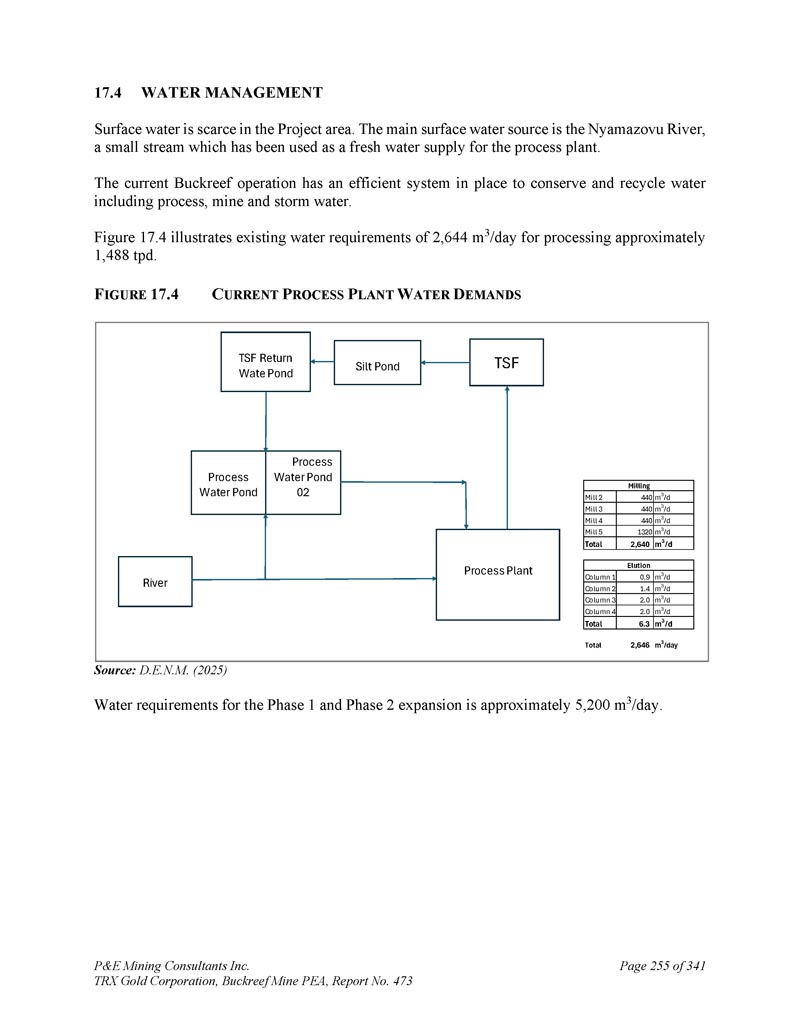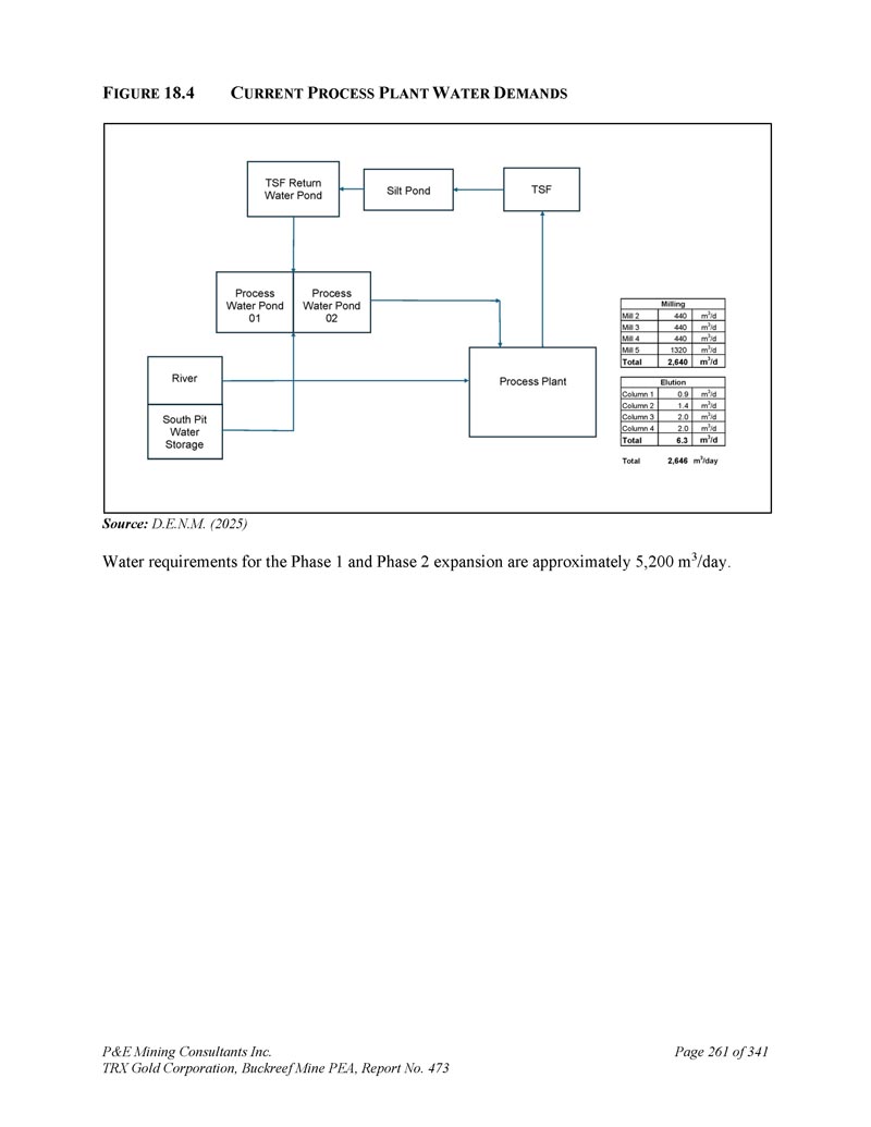F IGURE 18.4 C当前P ROCESS P LANT W ATER D EMANDS来源:D.E.N.M.(2025)1期和2期扩建的用水需求约为5,200 m3/天。P & E Mining Consultants Inc. TRX Gold Corporation,Buckreef Mine PEA,报告第473页,共341页第261页