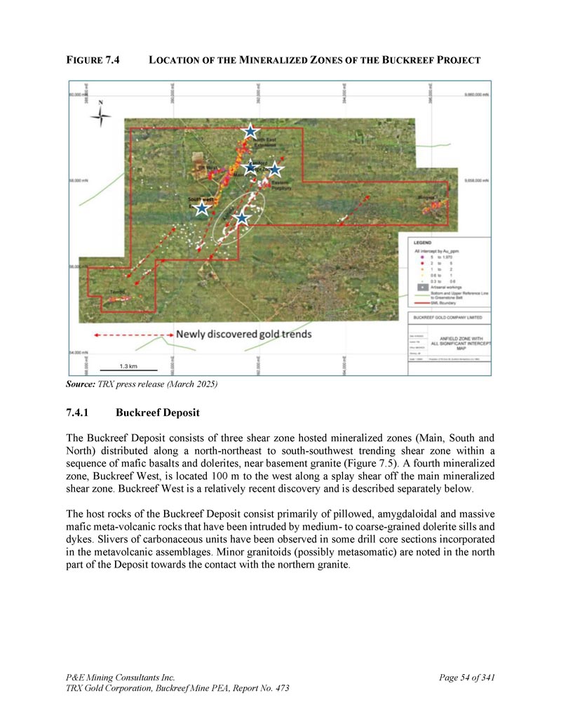 F IGURE 7.4 L OCATION of the M ineralized Z ones of the B UCKREEF P ROJECT来源:TRX新闻稿(2025年3月)7.4.1 Buckreef矿床Buckreef矿床由三个剪切带(主要、南部和北部)组成,分布在一系列镁铁质玄武岩和辉绿岩中,靠近基底花岗岩(图7。5 ) .第四个矿化带,Buckreef West,位于西面100米处,沿主要矿化剪切带的展开式剪切带。Buckreef West是一个相对较新的发现,下文将单独描述。Buckreef矿床的主岩主要由枕状、杏仁状和块状镁铁质变质火山岩组成,这些岩石曾被中到粗粒的辉绿岩岩脊和岩脉侵入。在变质火山组合中包含的一些钻芯部分中观察到了碳质单元的切片。与北部花岗岩接触的矿床北部发现了小型花岗岩(可能是交代的)。P & E Mining Consultants Inc. TRX Gold Corporation,Buckreef Mine PEA,报告第473页,共341页第54页