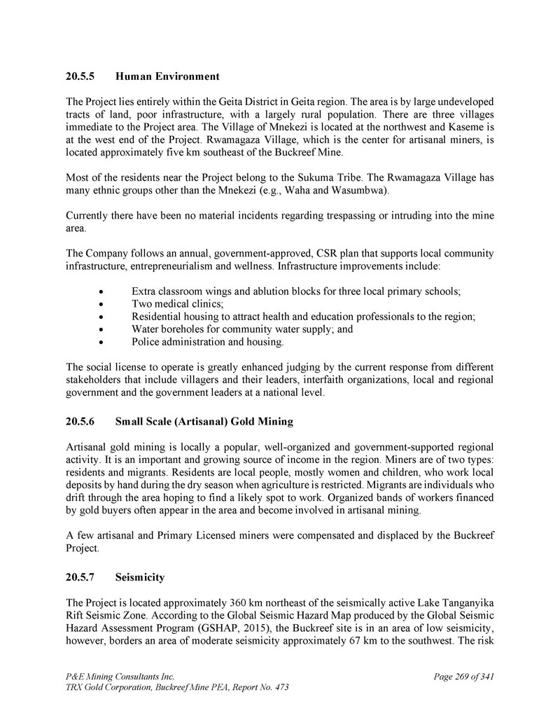 P & E Mining Consultants Inc. TRX Gold Corporation,Buckreef Mine PEA,第473号报告,共3415页,第269页。人类环境该项目完全位于盖塔地区的盖塔区范围内。该地区大片未开发的土地,基础设施差,以农村人口居多。项目区紧邻三个村。Mnekezi村位于西北部,Kaseme位于项目的西端。Rwamagaza村是手工采矿者的中心,位于Buckreef矿东南约5公里处。项目附近的居民大多属于Sukuma部落。Rwamagaza村有许多Mnekezi以外的民族(例如。,Waha和Wasumbwa)。目前没有发生任何有关侵入或侵入矿区的实质性事件。该公司遵循一项年度、政府批准的CSR计划,该计划支持当地社区基础设施、企业家精神和健康。基础设施改善包括:为当地三所小学增设教室侧翼和沐浴街区;两个医疗诊所;居民住房,以吸引卫生和教育专业人员到该地区;社区供水的水井眼;以及警察行政和住房。从目前包括村民及其领导人、宗教间组织、地方和地区政府以及国家层面的政府领导人在内的不同利益相关者的反应来看,经营的社会许可大大增强。6.小规模(手工)采金业手工采金业在当地是一项受欢迎、组织良好和政府支持的区域活动。它是该地区一个重要且不断增长的收入来源。矿工分为两类:居民和外来人口。居民是当地人,大多是妇女和儿童,他们在农业受到限制的旱季手工处理当地的存款。移民是在该地区漂流的个人,希望找到一个可能的工作地点。由黄金买家资助的有组织的工人团伙经常出现在该地区,并参与手工采矿。Buckreef项目对少数手工和初级持证矿工进行了补偿并使其流离失所。7.地震活动该项目位于地震活跃的坦噶尼喀湖裂谷地震带东北方向约360公里处。根据全球地震灾害评估计划(GSHAP,2015)制作的全球地震灾害地图,Buckreef遗址处于低地震活动区域,但在西南方向约67公里处与中等地震活动区域接壤。风险