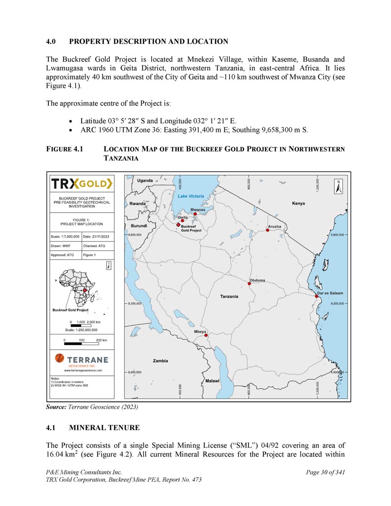 Buckreef黄金资产由一张特殊采矿许可证SML 04/92组成,面积为16。04公里2,含目前矿产资源。2022年3月,SML 04/92成功续展10年至2032年6月。该许可证由Buckreef Gold Company Limited(“BGC”)拥有,该公司是一家坦桑尼亚注册的合资公司,持股55%的TRX Gold Tanzania Limited和45%的STAMICO(坦桑尼亚国家矿业公司)。TRX Gold Tanzania Limited是TRX拥有100%股权的子公司。SML 04/92获授予采矿权。SML 04/92内的两个矿床,即Bingwa和Tembo,其地表权尚未获得担保,不包括在当前的矿产资源中。由于手工采矿活动,TRX尚未支付这两个区域的土地补偿。政府参与管理手工采矿活动,包括收取特许权使用费,而TRX正与政府合作,为这项活动寻找更长期的解决方案。图1。1展示了Buckreef黄金项目的位置图。F IGURE 1.1 L OCATION M AP of the B UCKREEF G OLD P ROJECT in N ORTHWESTER T ANZANIA资料来源:Terrane Geoscience(2023)P & E Mining Consultants Inc. TRX Gold Corporation,Buckreef Mine PEA,Report No. 473 page 2 of 341