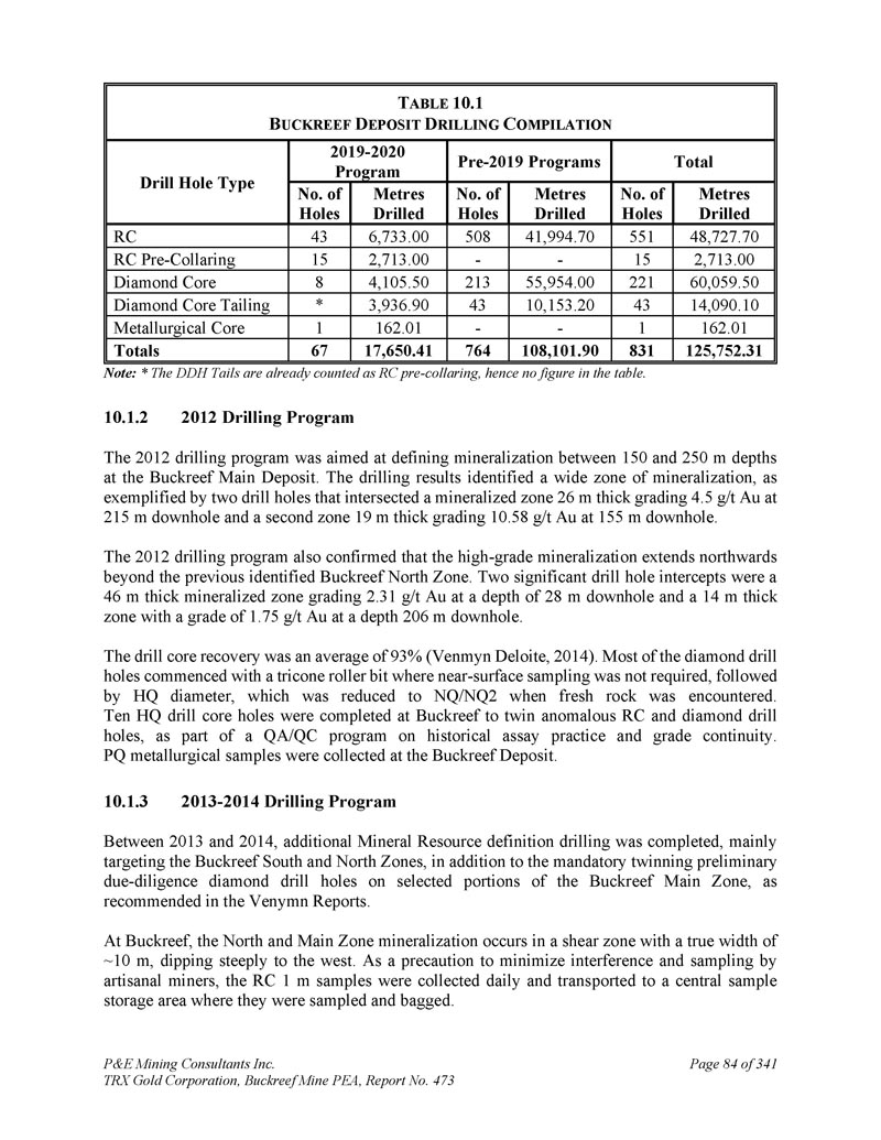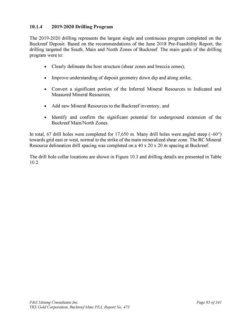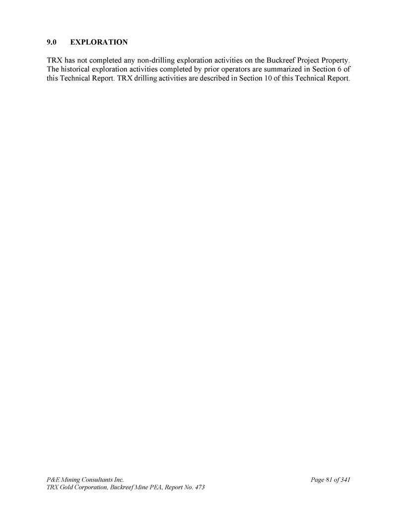 P & E Mining Consultants Inc. TRX Gold Corporation,Buckreef Mine PEA,第473号报告,共3419.0页第81页Exploration TRX并未完成对Buckreef项目财产的任何非钻探勘探活动。本技术报告第6节概述了先前操作人员完成的历史勘探活动。本技术报告第10节对TRX钻探活动进行了描述。