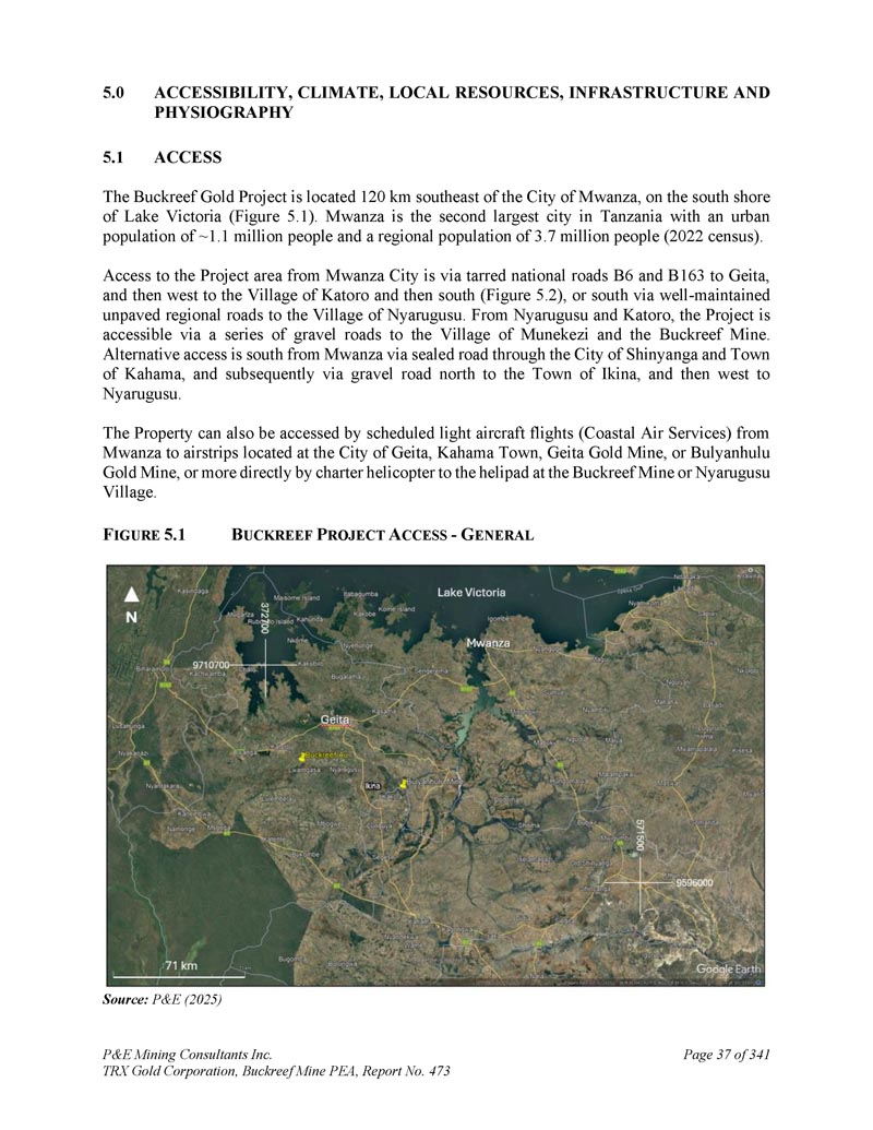 1.无障碍环境、气候、当地资源、基础设施和物理2。AcceSS Buckreef黄金项目位于Mwanza市东南120公里处,维多利亚湖南岸(图5。1 ) .姆万扎是坦桑尼亚第二大城市,城市人口约为1。100万人,区域人口3。700万人(2022年人口普查)。从姆万扎市进入项目区的通道是通过柏油国道B6和B163到达Geita,然后向西到达Katoro村,然后向南(图5。2),或向南通过维护良好的未铺砌区域道路到达Nyarugusu村。从Nyarugusu和Katoro,该项目可通过一系列碎石路到达Munekezi村和Buckreef矿。替代通道是从Mwanza向南通过密封道路穿过Shinyanga市和Kahama镇,随后通过碎石路向北到达Ikina镇,然后向西到达Nyarugusu。从姆万扎到盖塔市、卡哈马镇、盖塔金矿或Bulyanhulu金矿的简易机场的定期轻型飞机航班(沿海航空服务)也可以进入该物业,或者更直接地乘坐包机前往Buckreef矿或Nyarugusu村的直升机停机坪。F IGUR5。1 b UCKREEF P ROJECT A CCESS-G ENERAL来源:P & E(2025)P & E Mining Consultants Inc. TRX Gold Corporation,Buckreef Mine PEA,报告第473号,共341页第37页