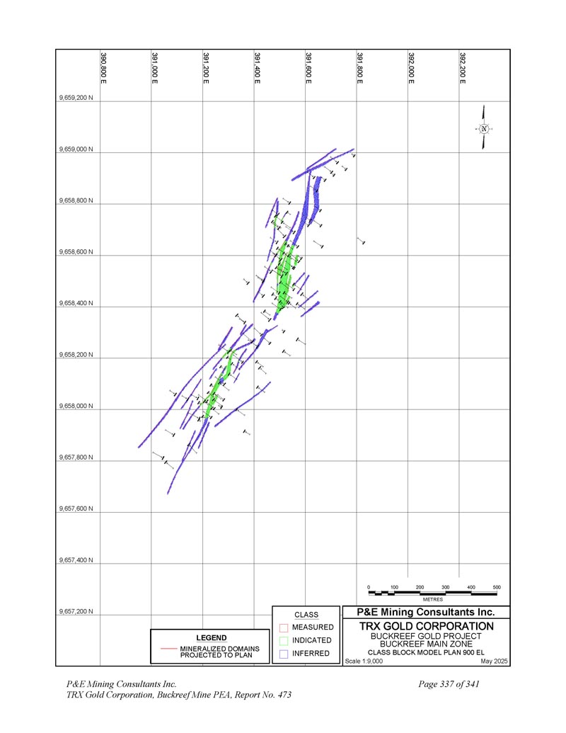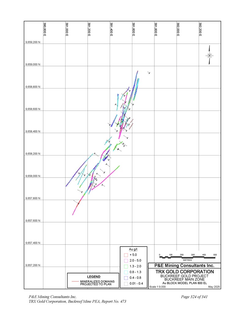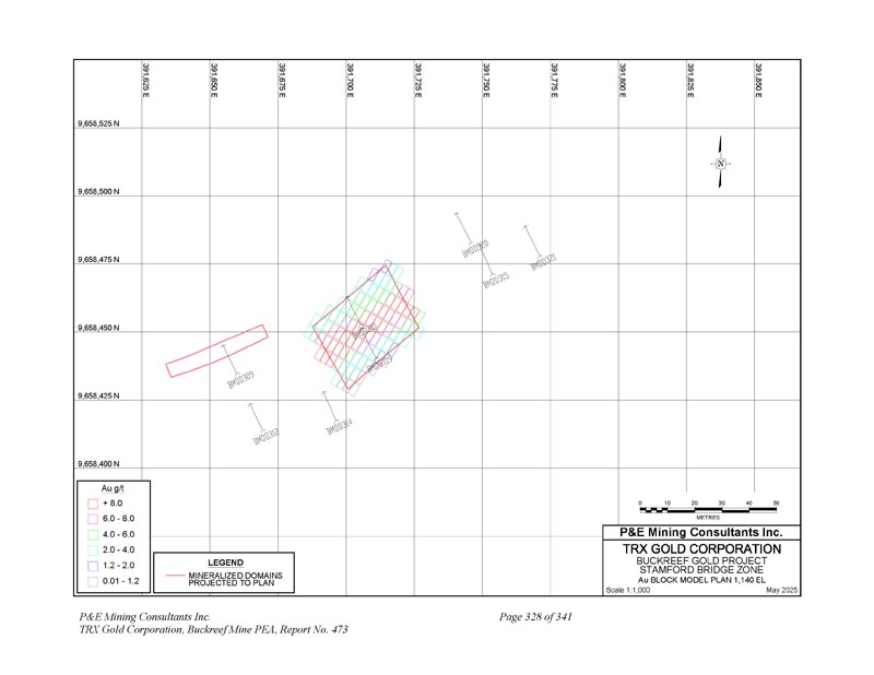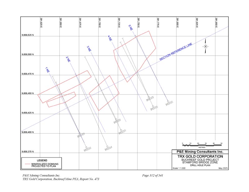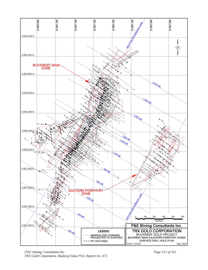 391,625 E 9,658,525 N规模1:1,0002025年5月N 9,658,500 N 9,658,475 N 9,658,450 N 9,658,425 N 9,658,400 N 391,650 E 391,675 E 391,700 E 391,725 E 391,750 E 391,750 E 391,850 E 391,850 E 01020304050 metres P & E Mining Consultants Inc. 9,658,375 N LEGEND Mineralized DOINS Projected to Plan BuckreeF Gold Project Stamford Bridge Zone Drill Hole PLAN P & E Mining Consultants Inc. TRX Gold Corporation,Buckreef Mine PEA,Report