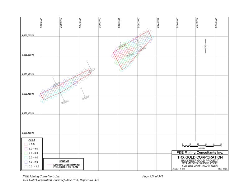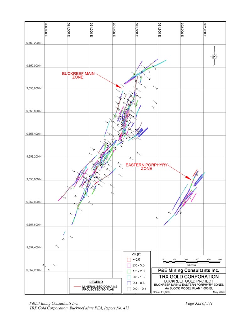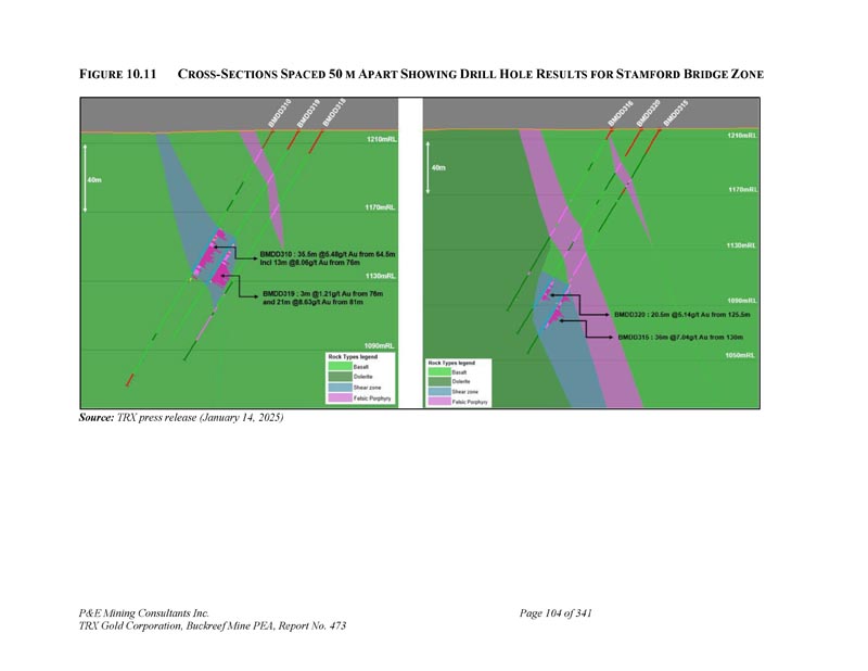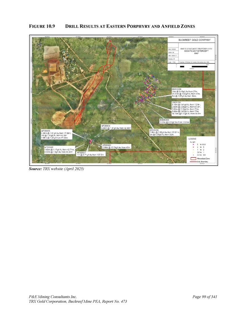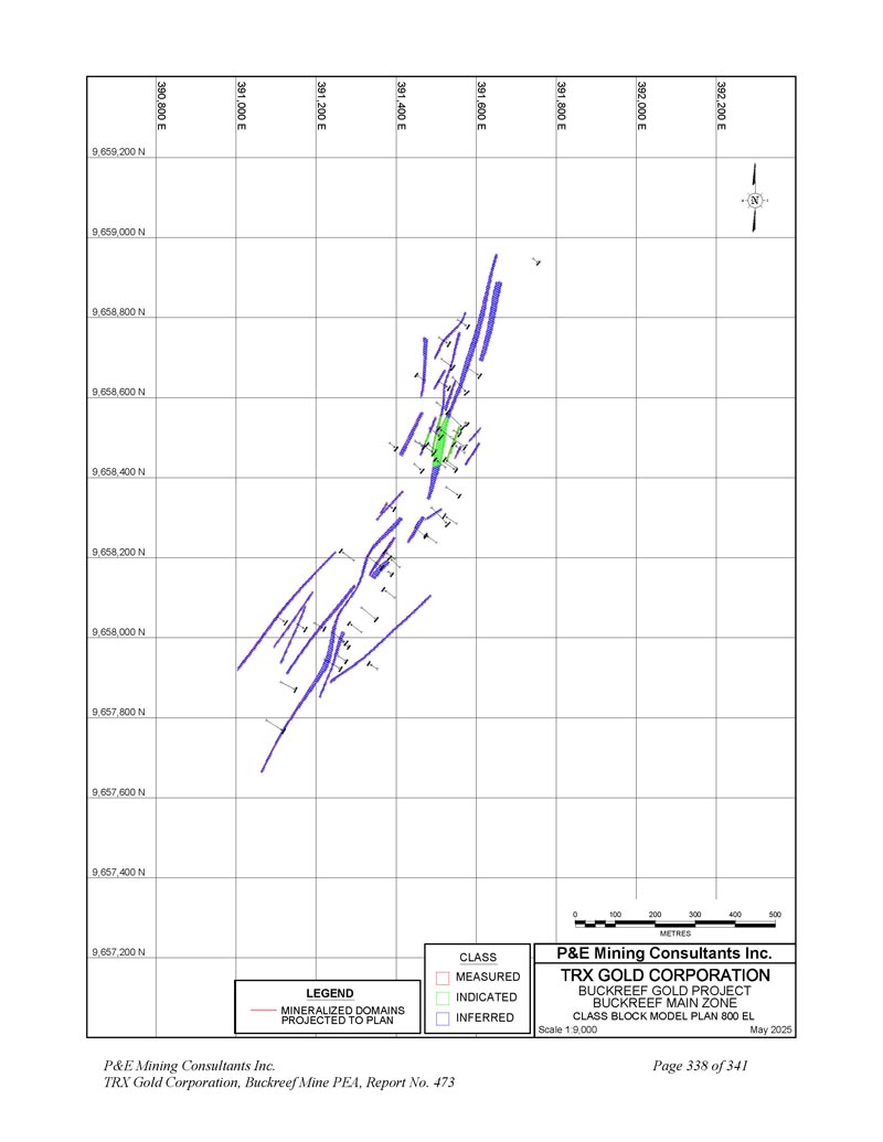 391,625 E 9,658,525 N规模1:1,0002025年5月N 9,658,500 N 9,658,475 N 9,658,450 N 9,658,425 N 9,658,400 N 391,650 E 391,675 E 391,700 E 391,725 E 391,750 E 391,750 E 391,850 E 391,850 E 01020304050 metres P & E Mining Consultants Inc. 9,658,375 N LEGEND Mineralized DOINS Projected to Plan BuckreeF Gold Project Stamford Bridge Zone Drill Hole PLAN P & E Mining Consultants Inc. TRX Gold Corporation,Buckreef Mine PEA,Report
