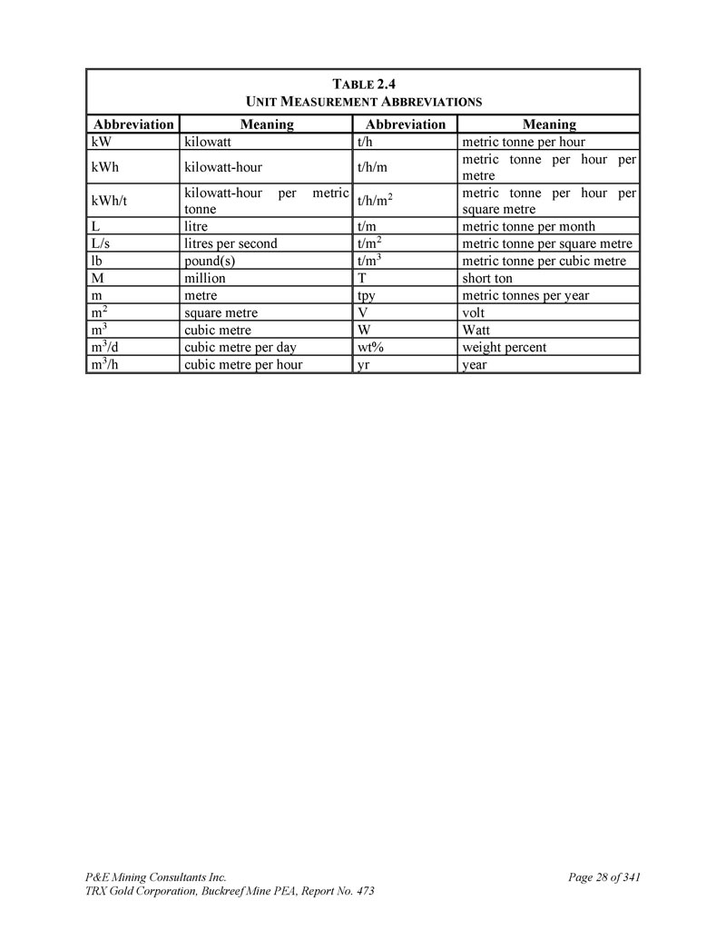 P & E Mining Consultants Inc. TRX Gold Corporation,Buckreef Mine PEA,第473号报告341页第28页T ABLE 2.4 U NIT M EASUREMENT A BBREVIATIONS意思缩写意思缩写公吨每小时t/h千瓦千瓦千瓦公吨每小时t/h/m kWh公吨每小时t/h/m kWh公吨每小时每平方米t/h/m 2千瓦/公吨kWh/t公吨每月t/m公升L公吨每平方米t/m 2公升每秒L/s公吨每立方米t/m 3磅(s)lb short ton tmillion mmetton每年tpy metm volt V metm m2 wattW立方米m3重量% wt %立方米每天m3/d年yr立方米每小时m3/h