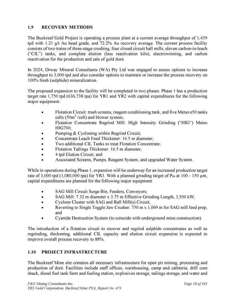 P & E Mining Consultants Inc. TRX Gold Corporation,Buckreef Mine PEA,Report No. 473 page 10 of 3411.9 Recovery methods Buckreef Gold项目正在以目前平均1,439 tpd的吞吐量运行一个加工厂,产量为1。21克/吨金头品位,与72。2% AU回收平均。目前的工艺设施包括两列三级破碎、四台闭路球磨机、十一个碳入浸出(“CIL”)罐,以及用于生产和销售gold dor é的完整洗脱(少再活化窑)、电积和碳再活化。2024年,Orway Mineral Consultants(WA)Pty Ltd受聘评估将吞吐量提高至3000吨/日的备选方案,并考虑维持或增加100%新鲜(硫化物)矿化的工艺回收率的备选方案。该设施的拟议扩建将分两个阶段完成。Phase 1的生产目标率为1,YR1和YR2为750吨/日(636,738吨/年),资本支出用于以下主要设备:浮选电路:垃圾桶、试剂调理池、以及五个美卓e50罐式电芯(50m3/电芯)和鼓风机系统;浮选精矿再研磨机:高强度研磨(“HIG”)美卓HIG700;再研磨电路内的泵送和循环;精矿浸出进料增稠器:直径16.5 m;额外的两个CIL罐体处理浮选精矿;浮选尾矿增稠器:直径16.5 m;4tpd洗出电路;以及相关的筛网、泵、试剂系统、升级后的水系统。在第1阶段运营期间,将进行扩建,以提高YR 3的产量目标率,即3000吨/日(1,080,000吨/年)。P规划磨削目标在100-150 μ m,资本支出规划用于以下主要设备:SAG磨机电路浪涌仓、馈线、输送机;SAG磨机:直径7.32 m x有效磨长3.75 m,3500 kW;带SAG和球磨机电路的旋风簇;恢复为单拨动颚式破碎机:750 m x 1,069 m用于SAG磨机进料准备;以及氰化物破坏系统(以配合地下矿山建设)。引入浮选回路以回收和再研磨硫化物精矿以及重新研磨、增稠、额外的CIL容量和洗脱回路扩展,预计将使整体工艺回收率提高到88%。1.10项目基础设施Buckreef矿址包含dor é露天采矿、加工和生产的所有必要基础设施。设施包括员工办公室、仓储、营地和自助餐厅、钻芯小屋、柴油油箱农场和加油站、爆炸物储存、尾矿储存、水和