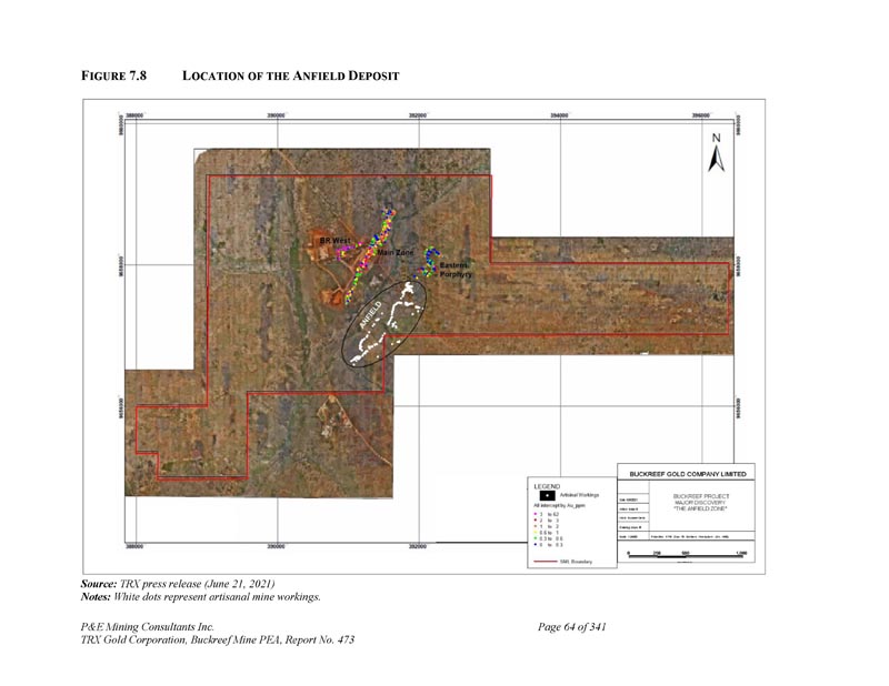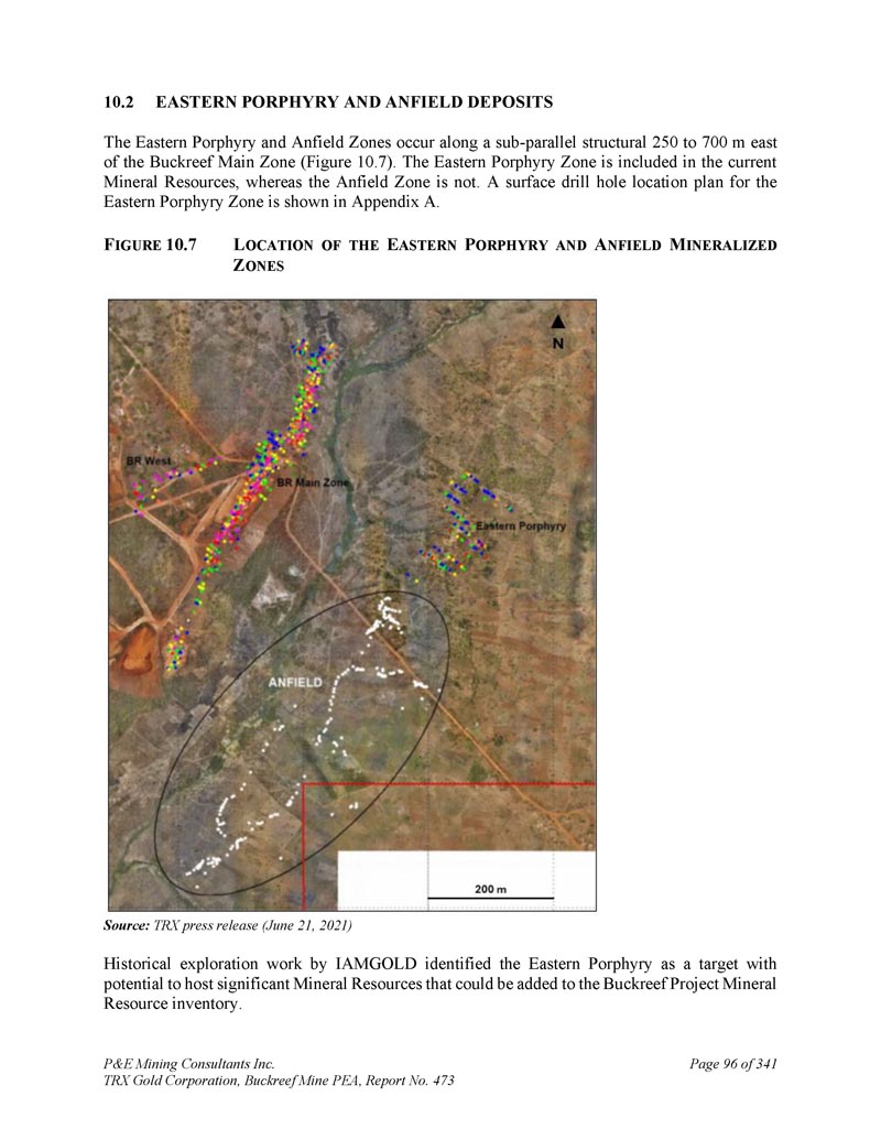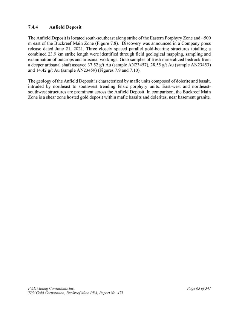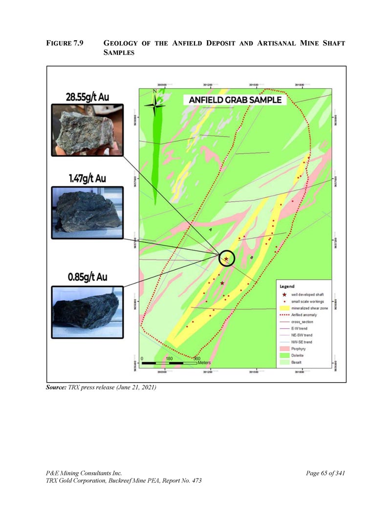 P & E Mining Consultants Inc. TRX Gold Corporation,Buckreef Mine PEA,第473号报告,3417.4.4 Anfield矿床第63页Anfield矿床位于东部斑岩带沿走向东南偏南,Buckreef主带以东~500米(图7。8 ) .Discovery是在2021年6月21日的公司新闻稿中宣布的。三个紧密间隔的平行含金结构,总计23个。通过野外地质测绘、露头取样和检查以及手工作业,确定了9公里的走向长度。从更深的手工竖井中提取新鲜矿化基岩样本化验出37。52克/吨金(样品AN23457),28。55克/吨金(样品AN23453)和14。42克/吨金(样品AN23459)(图7。9和7。10 ) .安菲尔德矿床地质特征为辉绿岩和玄武岩组成的镁铁质单元,受东北向至西南向长英质斑岩单元侵入。东西向和东北-西南向构造在安菲尔德矿床全境都很突出。相较而言,Buckreef主带是镁铁质玄武岩和辉绿岩内的剪切带主金矿床,靠近基底花岗岩。