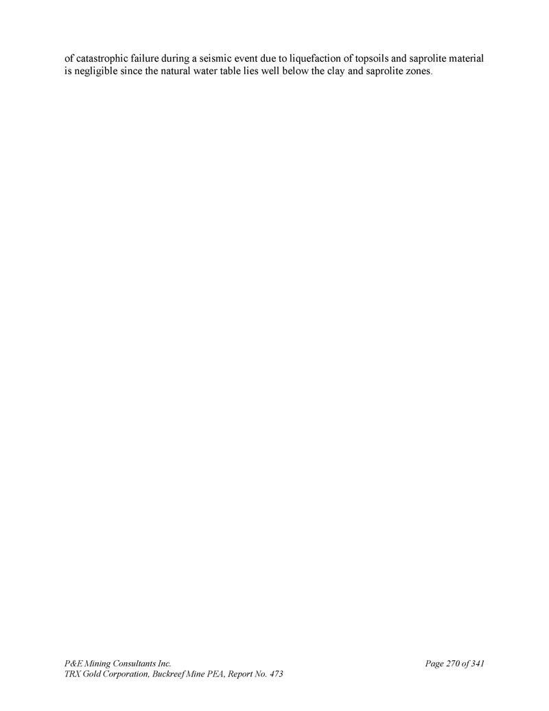P & E Mining Consultants Inc. TRX Gold Corporation,Buckreef Mine PEA,第473号报告,第341页第270页,由于表土和腐泥土材料的液化,地震事件期间的灾难性失效可以忽略不计,因为天然地下水位远低于粘土和腐泥土带。
