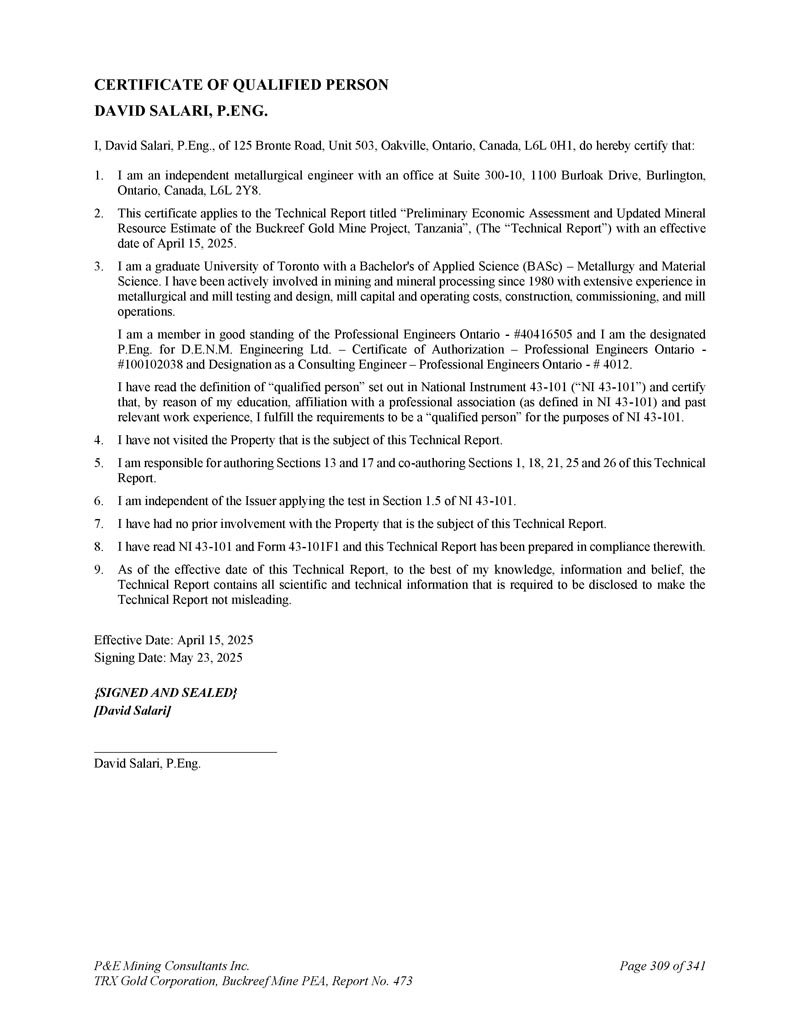 合格人员证书DAVID SALARI,P.ENG。I,David Salari,P.eng.,125 Bronte Road,Unit 503,Oakville,Ontario,Canada,L6L 0H1,兹证明:1。我是一名独立的冶金工程师,在Suite 300-10,1100 Burloak Drive,Burlington,Ontario,Canada,L 6 L 2 Y 8设有办公室。2.本证书适用于题为“坦桑尼亚Buckreef金矿项目的初步经济评估和更新的矿产资源估算”的技术报告(“技术报告”),生效日期为2025年4月15日。3.我是多伦多大学的研究生,获得应用科学(BASC)–冶金和材料科学学士学位。我从1980年开始积极参与采矿和选矿,在冶金和磨机测试和设计、磨机资金和运营成本、建设、调试和磨机运营方面拥有丰富的经验。我是Professional Engineers Ontario-# 40416505信誉良好的成员,我是D. E. N. M. Engineering Ltd.的指定P. Eng. –授权证书– Professional Engineers Ontario-# 100102038和被指定为咨询工程师– Professional Engineers Ontario-# 4012。本人已阅读National Instrument 43-101(“NI 43-101”)中对“合格人员”的定义,并证明,由于本人的学历、与专业协会的隶属关系(如NI 43-101中的定义)和过去的相关工作经验,本人符合NI 43-101中的“合格人员”要求。4.我没有访问过本技术报告主题的物业。5.本人负责撰写本技术报告第13和17节及共同撰写第1、18、21、25和26节。6.我独立于发行人应用NI 43-101第1.5节中的测试。7.我之前没有参与过本技术报告主题的物业。8.我已经阅读了NI 43-101和表格43-101F1,本技术报告是按照这些标准编写的。9.截至本技术报告生效之日,据本人所知、所知及所信,技术报告载有为使技术报告不具误导性而须予披露的所有科技资料。生效日期:2025年4月15日签署日期:2025年5月23日{签署并盖章} [ David Salari ] David Salari,P.Eng。P & E Mining Consultants Inc. TRX Gold Corporation,Buckreef Mine PEA,报告第473期,共341页第309页