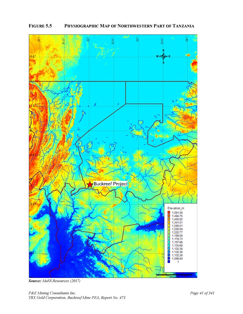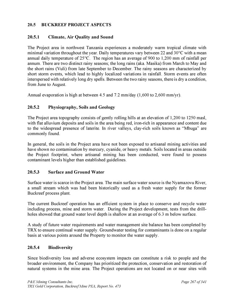 P & E Mining Consultants Inc. TRX Gold Corporation,Buckreef Mine PEA,第473号报告,第341页第267页5。Buckreef项目方面1。气候、空气质量和声音坦桑尼亚西北部的项目地区经历了中等温暖的热带气候,全年变化极小。日气温变化范围为22至30 ° C,年平均日气温为25 ° C。该地区平均每年降雨量为900至1,200毫米。有两个截然不同的雨季;长雨(又名。Masika)的3月至5月和9月下旬至12月的短雨(vuli)。雨季的特点是短时间的风暴事件,导致降雨量高度局部性变化。风暴事件往往穿插着相对较长的干旱期。两个雨季之间,有一个干燥的条件,从6月到8月。年蒸发量高在4之间。5和7。2毫米/天(1,600至2,600毫米/年)。2.地貌、土壤和地质项目区域地形由海拔1,200至1250 masl平缓起伏的丘陵组成,由于红土的广泛存在,区域内平坦的冲积层和土壤呈红色、富含铁的外观和含量。在河谷中,通常会发现被称为“Mbuga”的富含粘土的土壤。总体而言,项目区的土壤没有受到手工采矿活动的影响,也没有出现汞、氰化物或重金属污染的情况。位于项目足迹以外区域的土壤,在那里进行了手工采矿,被发现污染物水平高于既定准则。3.地表水、地表水项目区域地表水稀缺。主要的地表水源是Nyamazovu河,这条小溪在历史上曾被用作前Buckreef加工厂的淡水供应。目前的Buckreef行动有一个高效的系统,以保存和回收水,包括过程水、矿井水和雨水。在项目开发过程中,从钻孔进行的测试表明,地下水位深度平均为6.浅。地表以下3米。对未来用水需求及水管理场地平衡情况进行了研究,由TRX完成,以确保持续供水。物业周边多个点位定期进行地下水污染物检测,监测供水情况。4.生物多样性由于生物多样性丧失和不利的生态系统影响可能对人类和更广泛的环境构成风险,公司已优先保护、保护和恢复矿区的自然系统。项目运营不位于或靠近具有