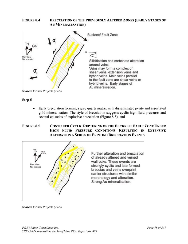 F IGURE 8.4 B reciation of the P reviously a ltered Z ones(e ARLY S tages of a U m ineralization)来源:Virimai Projects(2020)Step 5早期角砾岩形成灰色石英基质,并伴有浸染黄铁矿和伴生金矿化。角砾岩的风格暗示了周期性的高流体压力和几次爆炸性角砾岩事件(图8。5);和F IGURE 8.5 C ONTUED C YCLIC R UpUding of the B UCKREEF F AULT Z ONE U NDER H IGH F LUID P RESSURE C ONDITIONS R ESULTing in e Extensive A LERATION A S ERIES of P RINTing B RECCIATION E VENTS来源:Virimai projects(2020)P & E Mining Consultants Inc. TRX Gold Corporation,Buckreef Mine PEA,Report No. 473 page 78 of 341
