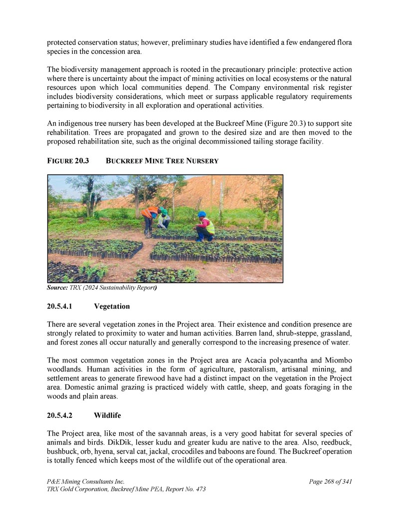 受保护的保护状况;然而,初步研究已在特许区内确定了少数几个濒危植物物种。生物多样性管理方法根植于预防原则:采矿活动对当地生态系统或当地社区所依赖的自然资源的影响存在不确定性的保护行动。公司环境风险登记册包括生物多样性考虑因素,这些因素在所有勘探和运营活动中达到或超过与生物多样性有关的适用监管要求。Buckreef矿开发了本土苗圃(图20。3)支持场地修复。树木被繁殖和生长到所需的大小,然后被转移到拟议的修复地点,例如原来退役的尾矿储存设施。F IGURE 20。3 B UCKREEF M INE T REE N URSERY来源:TRX(2024年可持续发展报告)1。植被项目区内有几个植被带。它们的存在和条件的存在与接近水和人类活动密切相关。贫瘠的土地、灌木-草原、草原、林区都是自然发生的,大体对应着水的不断增多。项目区内最常见的植被带为相思树(Acacia polyacantha)和米翁博林地(Miombo woodlands)。人类以农业、畜牧业、手工采矿、聚居区生柴等形式开展的活动,对项目区的植被产生了明显的影响。家畜放牧普遍采用牛、羊、山羊在树林和平原地区觅食。2.野生动物该项目区与大部分大草原地区一样,是几种动物和鸟类的非常好的栖息地。DikDik、较小的kudu和较大的kudu原产于该地区。此外,还发现了芦苇、灌木、宝珠、鬣狗、伺服猫、豺狼、鳄鱼和狒狒。Buckreef行动完全被围起来,这使得大部分野生动物无法进入行动区域。P & E Mining Consultants Inc. TRX Gold Corporation,Buckreef Mine PEA,报告第473页,共341页第268页