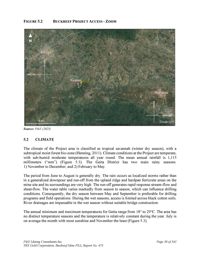 F IGURE 5.2 B UCKREEF P ROJECT A CCESS-Z OOM来源:P & E(2025)5。2气候项目区气候划分为热带大草原(冬季旱季),亚热带湿润森林生物带(恒宁,2011年)。该项目的气候条件是温和的,全年都有亚湿润的中等温度。年平均降雨量1,115毫米(“mm”)(图5。3 ) .盖塔区主要有两个雨季:1)11月至12月;2)2月至5月。6月至8月期间总体干燥。此次降雨以局部风暴的形式出现,而不是在一场普遍的倾盆大雨中出现,并从矿址及其周围的高地山脊和硬盘铁铁矿区域中径流而来。The run-off生成快速响应流-flow和sheet-flow。各季节地下水位变化明显,可影响钻井条件。因此,5月至9月的旱季更适合钻探计划和现场作业。在丰水期,黑棉土壤的出入受到限制。没有合适的桥梁建设,丰水期河道排水无法通行。盖塔的年最低和最高气温范围为18 ↓至29 ↓℃。该地区没有明显的温季,一年中气温相对恒定。平均7月是日照最多的月份,11月是最少的月份(图5。3 ) .P & E Mining Consultants Inc. TRX Gold Corporation,Buckreef Mine PEA,报告第473页,共341页