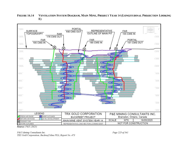 F IGURE 16.14 V ENTILATION S YSTEM D IAGRAM,M AIN M INE,P ROJECT Y EAR 14(L ONGITUDINAL P ROJECTION L OOKING E)资料来源:P & E(2025)P & E Mining Consultants Inc. TRX Gold Corporation,Buckreef Mine PEA,第473号报告,共341页第225